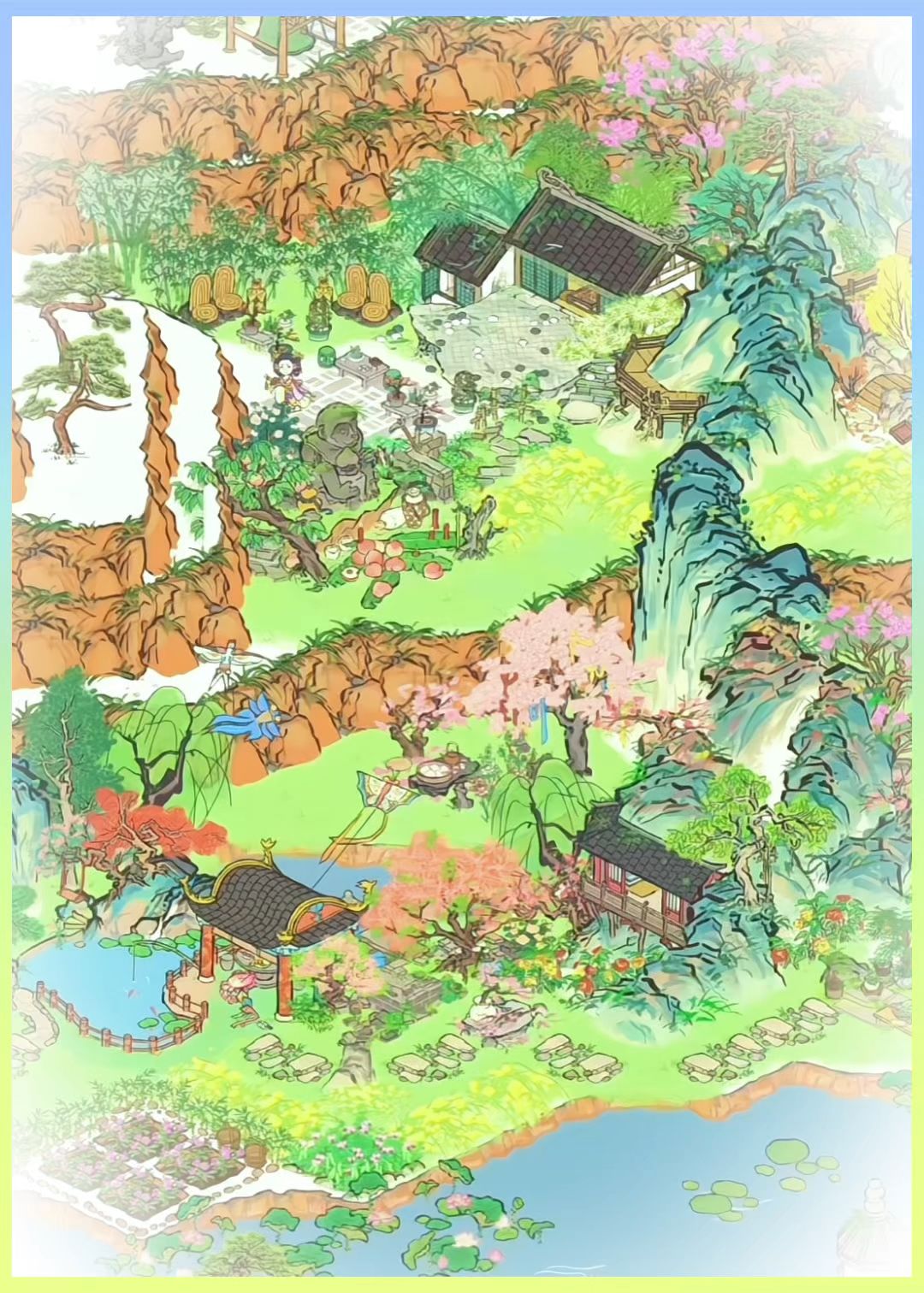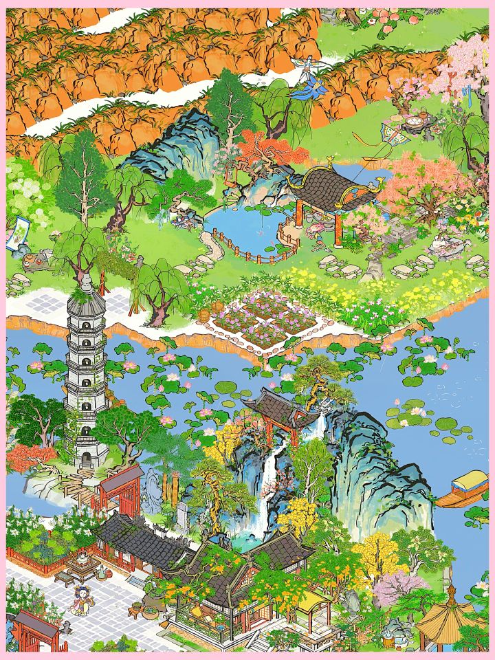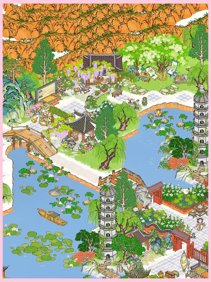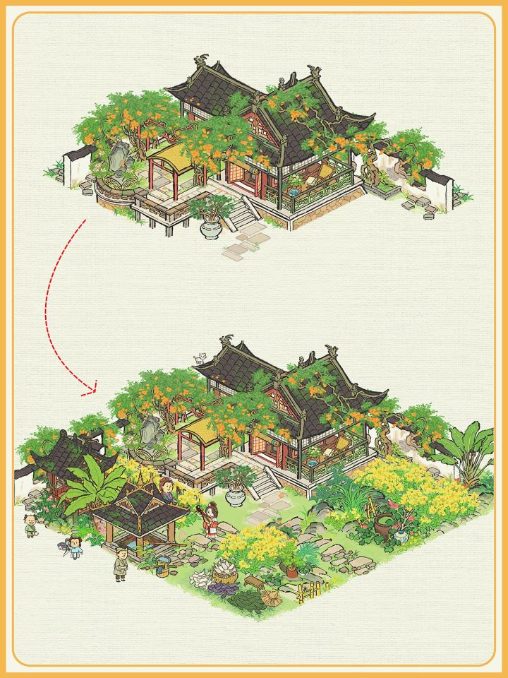 建筑:凌霄宅前花,墙花半隐,远山亭,亭井,蔓蔓瓜藤,茄瓜摊,小石板,丛丛篱苔,蔓蔓瓜藤,疏疏蕉叶,乱石灌木,半亩油菜#江南百景图 #江南百景图布局