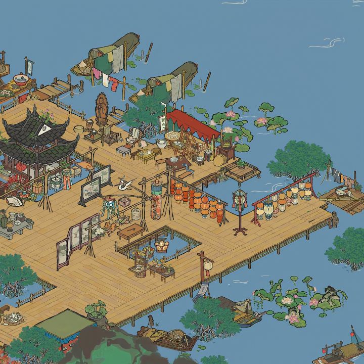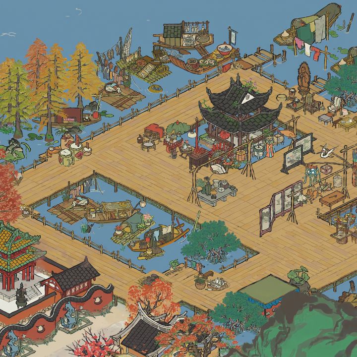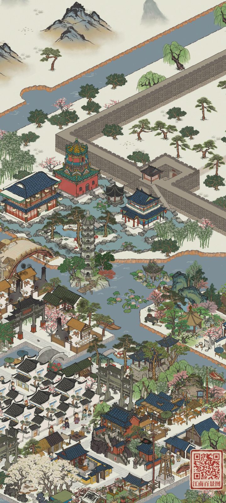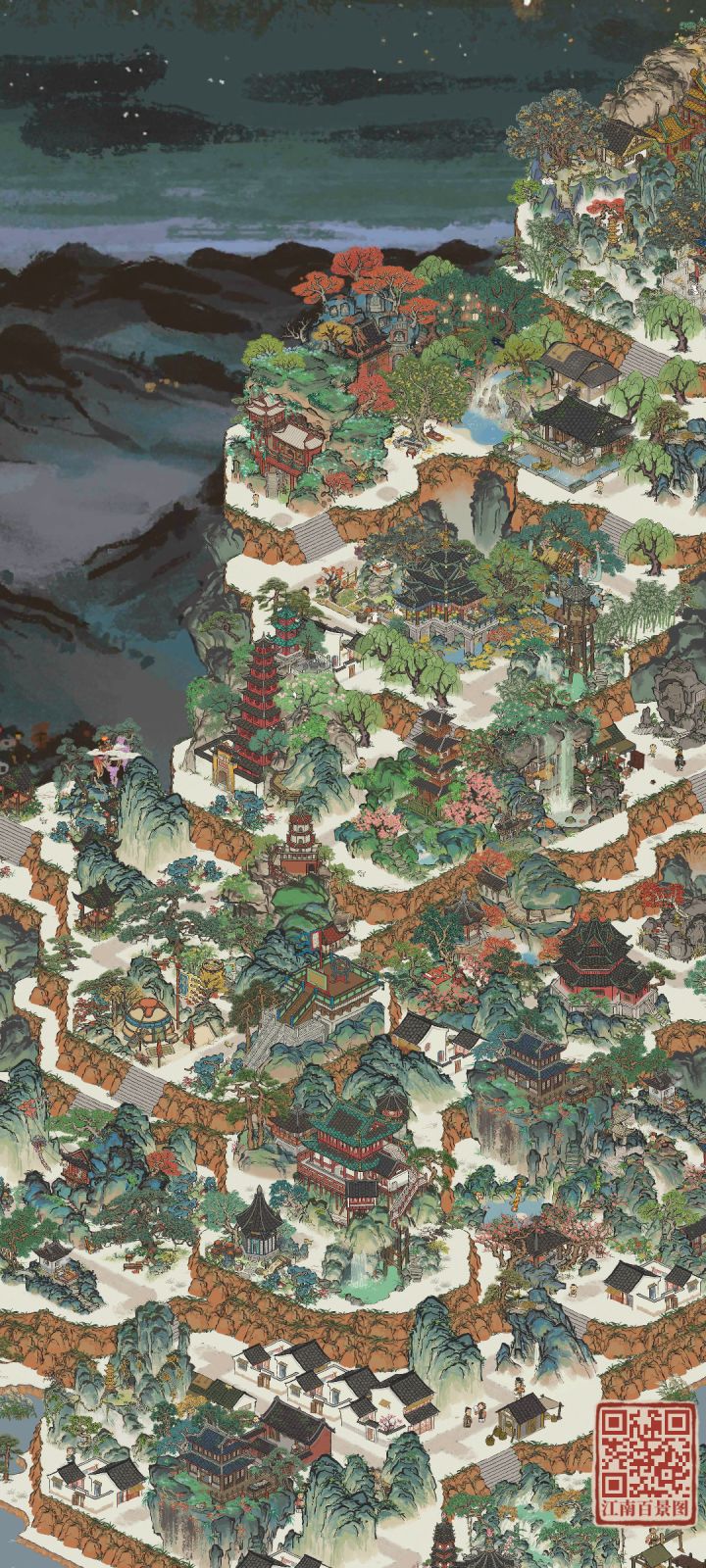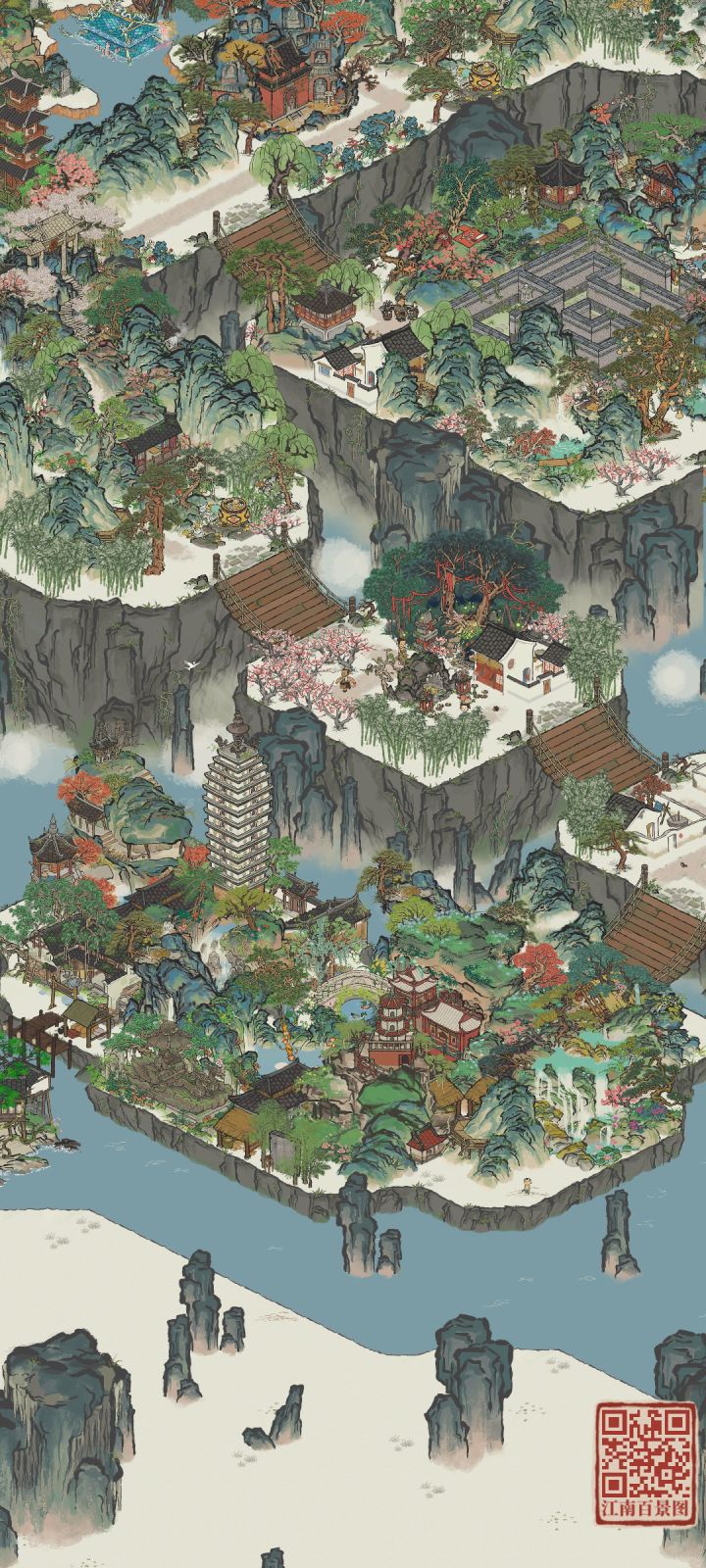 建筑:芳菲山径,听风塔,春临山道,愁空山,伏鹿山,停云山,青菜圃,屋边野树,绵绵生瓜摊,墙花半隐,乱石灌木,半亩油菜,蔓蔓瓜藤,青青石板,疏疏蕉叶,小石板#江南百景图 #江南百景图