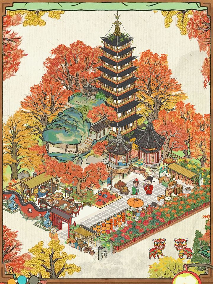 建筑:灵麒塔,霜红小径,套圈摊,心乐亭,重阳糕工坊,连香树,知秋落枫,金钱松,火树花灯墙,火腿摊#江南百景图 #江南百景图布局 #发现好游戏