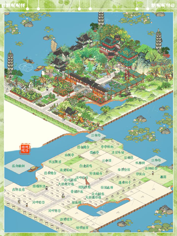 地点:扬州府明月边+停云边+春江边建筑:秦晋会馆|云中阁|借幽亭|荷花池塘|过梁秋千|溪畔悠悠|白虎晨鸣|疏食菜畦|碧水楼台|临溪亭|棋盘闲居|绿蚁新酒|吉祥长廊|青龙泮池|良时回廊|火树花灯墙|古柳迎春|清夏木栾|亭亭枇杷|最相思|古柳迎春|果园|江中塔#江南百景图 #江南百景图扬州府 #江南百景图布局