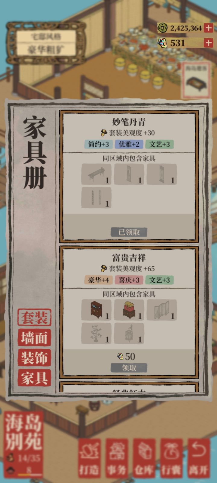 妙笔丹青是我应天府邸里的,这是椰子岛的府邸。我怎么感觉以前好像是都可以修建然后领的呀