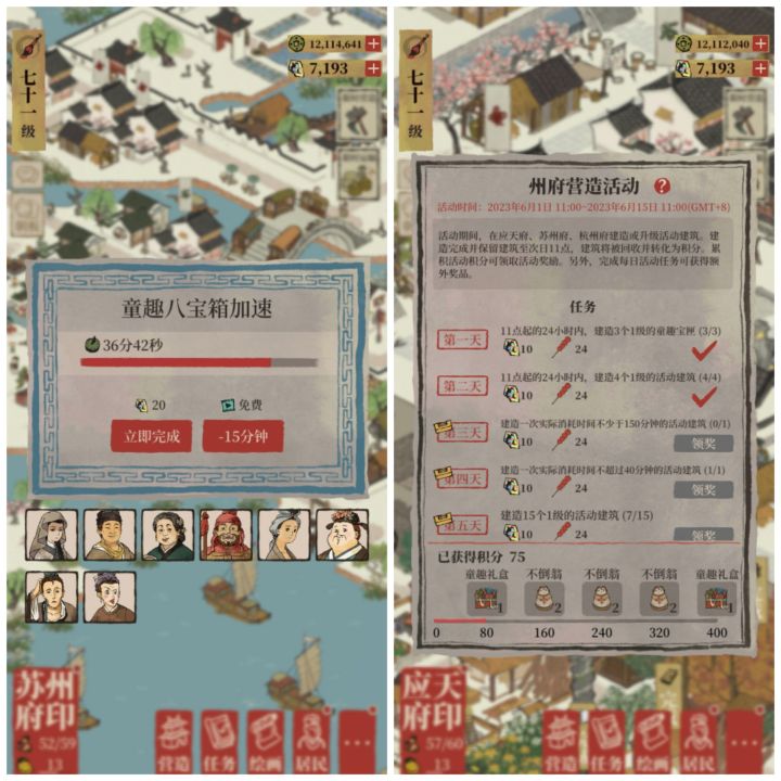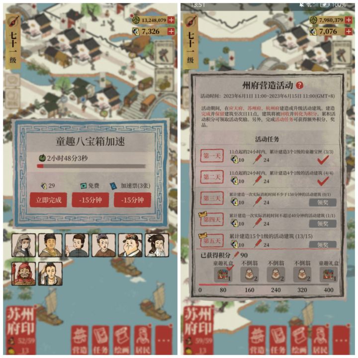 童趣八宝箱需要3个小时,我的沈万千建造时间-6%,需要2小时48分钟,一共168分钟。可是完成之后,第三天150分钟以上的任务还是未完成(0/1),这个任务到底怎么过呀?——汇总一下各位知府提供的办法:1、选择童趣八宝箱,2、使用建筑属性减免时间低于15%的特殊人物,建议卿级、等级低的,3、不可使用加速票或看广告提前完成。如果还是不行,可能是系统bug,多试两次,应苏杭三座城市最多各建