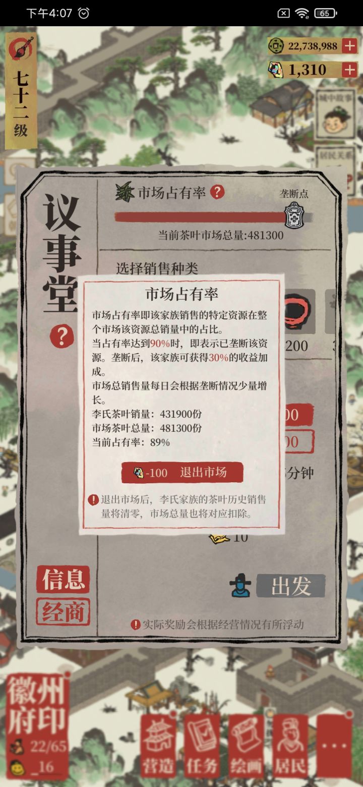 我真的无语了,之前本来还是不信的,没想到竟然发生在我身上。今天下午四点多,按了一下计算器,发现还需要销售4000个茶叶就能垄断茶叶市场了,连忙安排徽商李出去,还用了问政山笋,之前已经发现额外卖了两笔4000茶叶的,发现没有算入茶叶的销售总量中,以为是因为全部用了问政山笋减时的原因,这次特地还留了一个四十分钟的缓冲期,结果,谁懂啊,使用了问政山笋加速的量依旧算不到销售总量中,请问这个是新出的规定吗