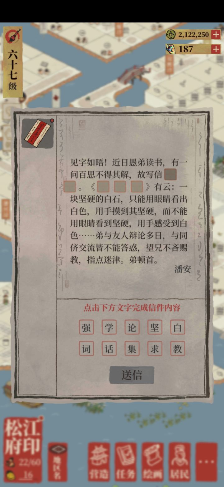 苏州宅邸点翰林任务,做到3/5就进行不下去天,有人做完这个任务吗?请问这个有什么特殊机制吗?除了任务显示的,还需要特殊东西吗?
