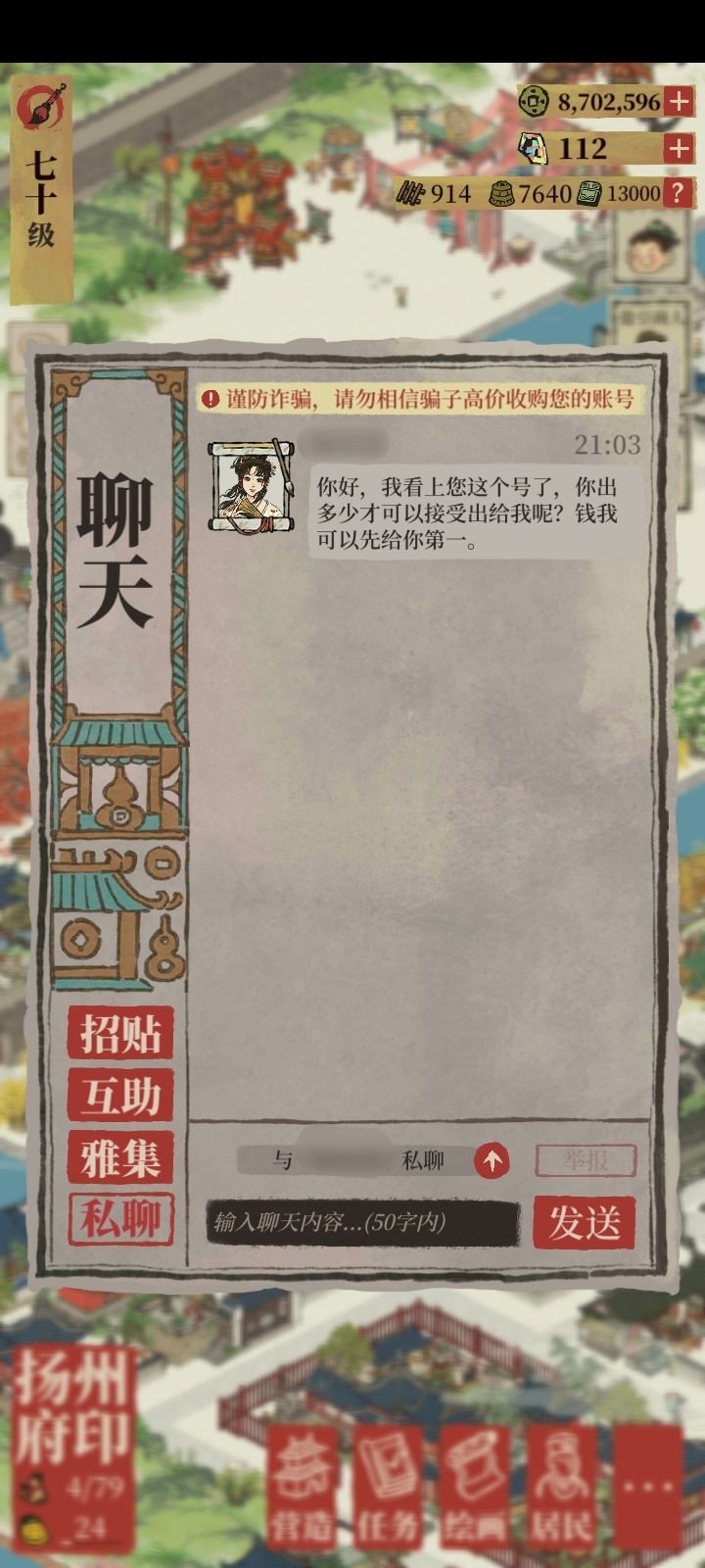 刚刚有个人说看上我的号了,还问我多少出,我本来是打算礼貌拒绝的,刚要回复突然看到上面的那行红字,所以这该不会是个骗子吧?