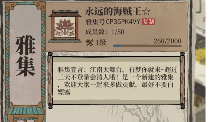 CP3GPK4VY欢迎大家来玩!因为考研暂停了一年没有搞小图,回来了以后才发现有雅集这个东西,就新建了一个,欢迎大家的加入,但是超过三天不做贡献可能会被清出去哦召集同伴,速来一起搞事情#攻略#江南百景图