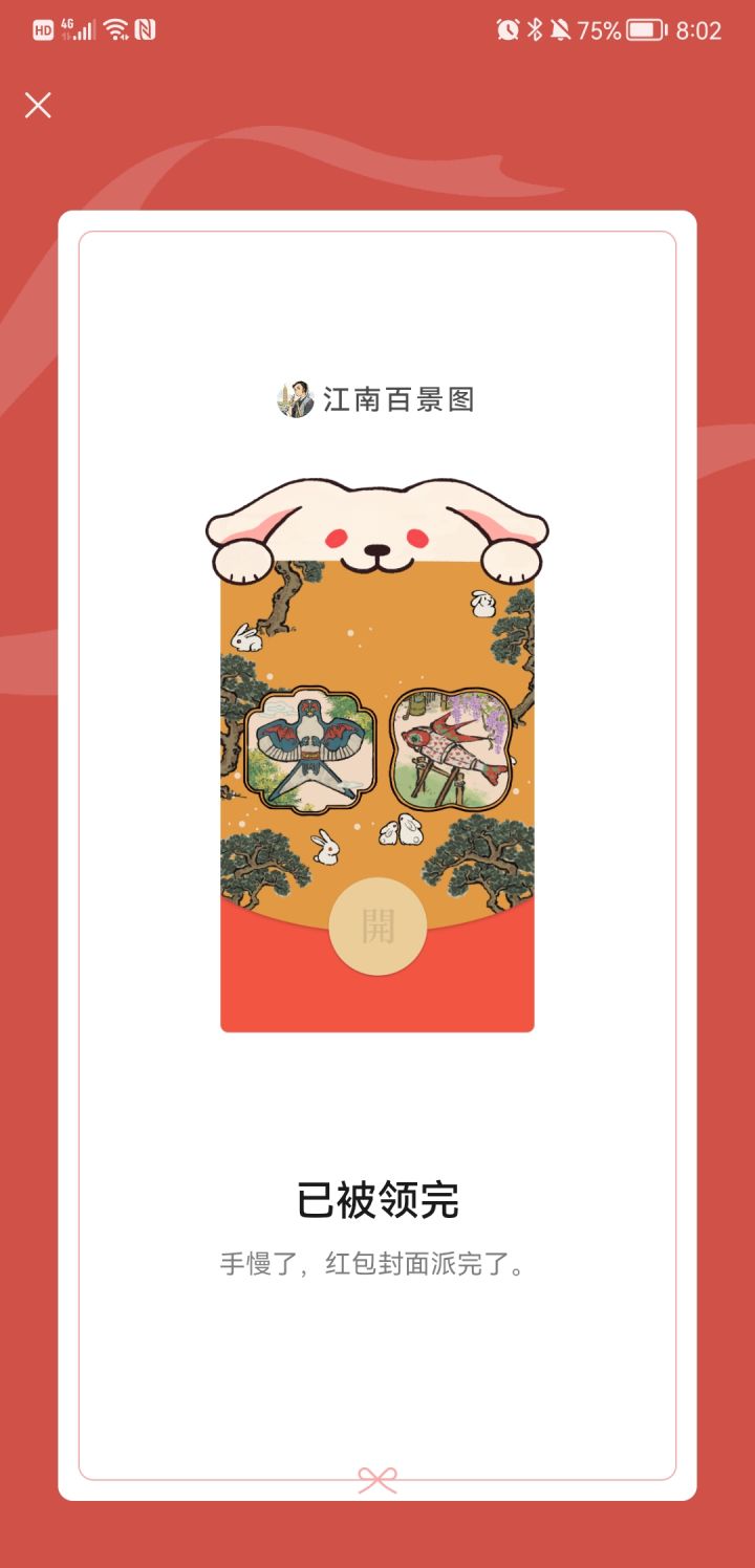 呜呜呜红包封面……我的红包封面……明明定了闹铃了,却因为把“千门万户”记成了“千家万户”而耽误了两分钟!!呜呜呜它离我而去了,我最爱的红包封面……