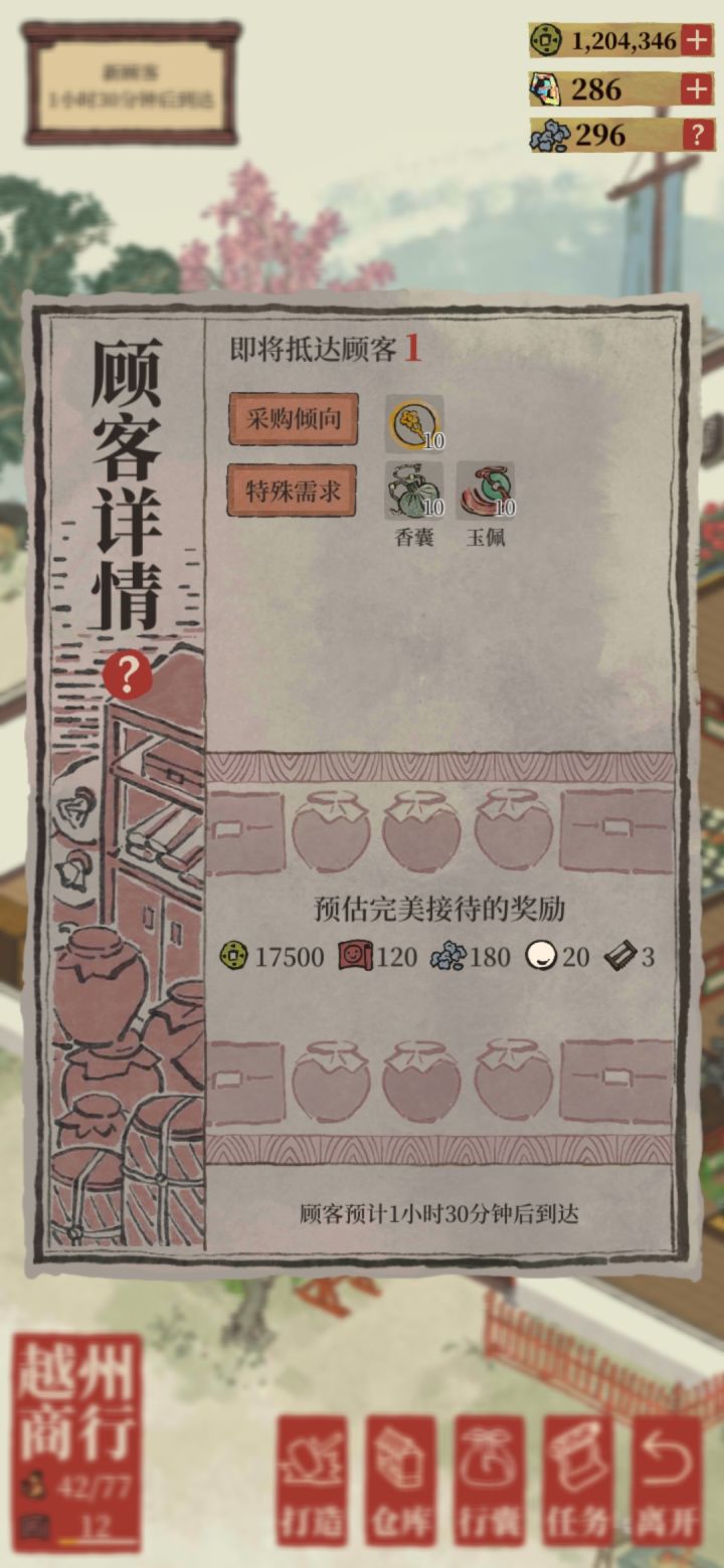 因为绍兴府一开始没太玩明白,加上对越州商行没上心,导致并没有保证每次完美接待,然后布局安排什么的也一开始没弄好,导致十级之后依然没能凑够足够的锯子,一直原地打转,没能扩展里面的铺位。十级之后需求量增加,更是恶性循环😤,越州商行我是玩不转了……
