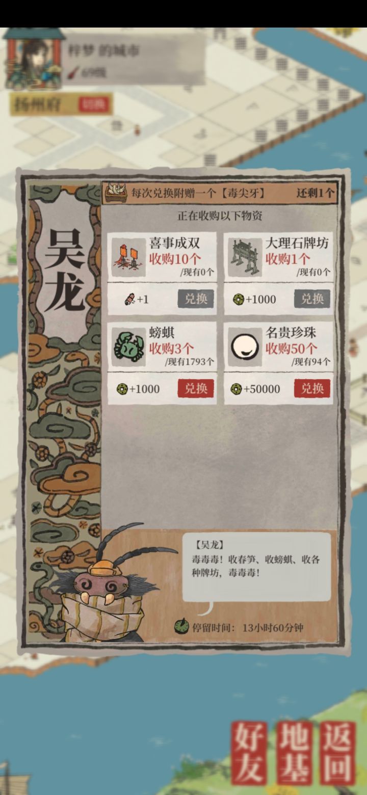 珍珠的用处不大了,回收的商家已经出现了!!黑心!吴龙!50个珍珠50000铜。