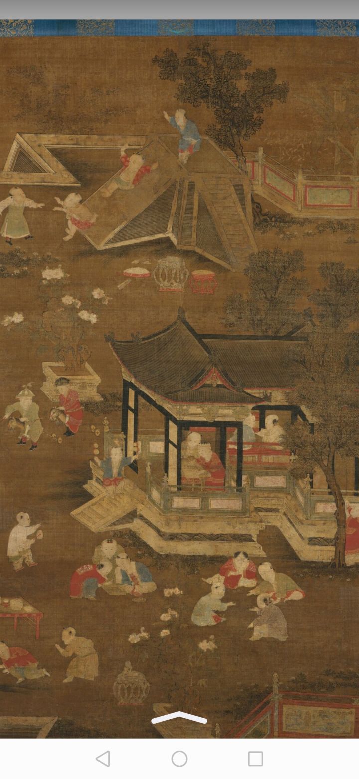 宫菀婴戏图:明代,作者佚名。收藏于大都会艺术博物馆。画面绘后院数名孩子嬉戏打闹的场景。院中的芙蓉花开正盛,树叶渐黄。最上端有个类似于现代滑滑梯的玩具,三个孩子从上往下滑;中部亭子里、长廊上孩子们看书、下棋,外面的空地上孩子们骑着木马、捉着蛐蛐、玩着孩子们喜欢的游戏。。。儿童乐园里,孩子们玩得不亦乐乎!