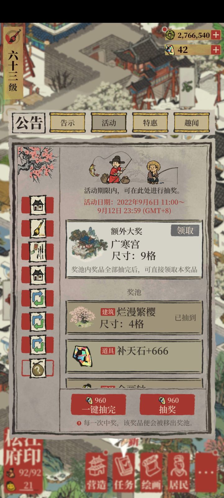 接上条,按大家的说法客栈乞丐刷9个,下午4点可以领,自己努力攒了300个,要看遥遥无期。怎么凑够960个补天石。我就刷起徽州府探险来了,一开始没玩,刷了两个章节还差20个补天石能到960,我探险体力没有了,我不能坐以待毙,结果江南七怪刷到了,我就赶紧兑换了,这种额外的惊喜谁不喜欢,本来像过山车一样以为没有着落,得到了,太开心了,我终于有我自己的广寒宫了,爱了爱了#广寒宫