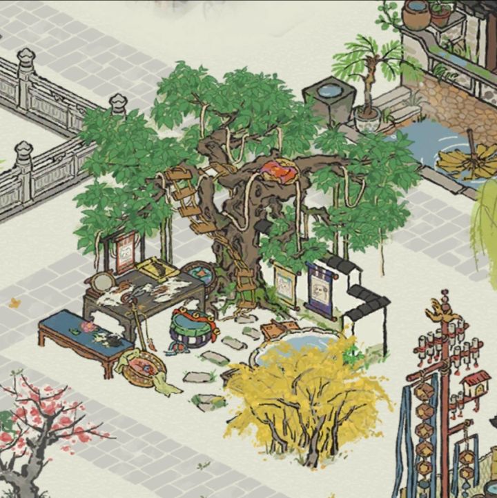 改猫犬主题建筑?乍一看有点像垂须榕树。还有猫爬架,墙上挂了幅狗椰头像图二胭脂铺
