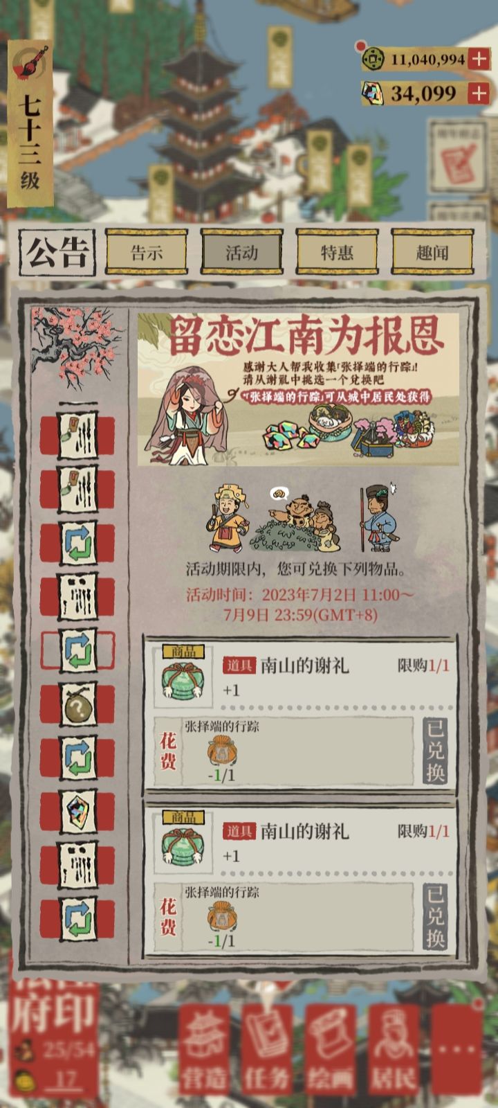 正值毕业季,新版本上线已满一周1/“涂山灵狐恋江南”免费抽奖已一键抽完2/“张择端先生去哪了”八条线索已集齐3/“留恋江南为报恩”奖励已全部兑换4/“观月上书季”朝板免费奖励已一键领取但毕业不总是这么轻松——5/“小筑画池”无缘天级和园林小景(士!😖)6/累消未至,椰子岛民宅升级暂缓7/岛上八处椰子多多,但是开发寸步难行8/上线不频,高贵的道具生产不足9/想过张择端+改良农田刷