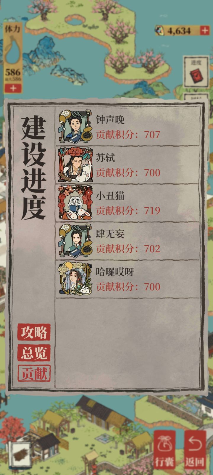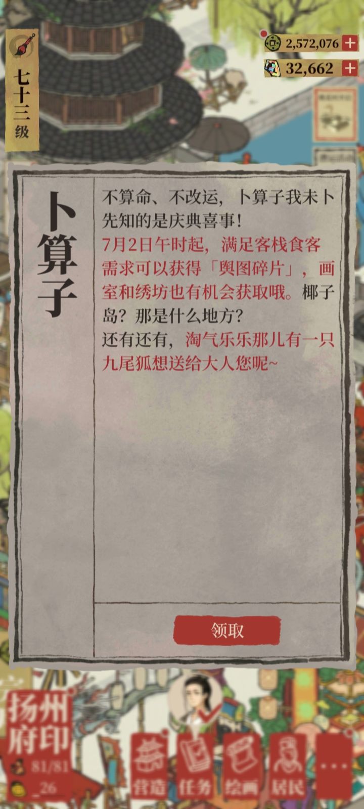 徽州-应天-苏州-扬州-绍兴-杭州-松江-鸡鸣山加载动画是八个城市的全家福!/123新闲人“卜算子”开启为期一个月的城中游荡,分五个阶段给予不同福利,记得领取~/4567/论坛签到开始,蚊子肉也是肉!8/桃花村如期而至,攒齐新建筑任重道远~9/漕运商会也上新啦,今日购入“石斛兰”×3~