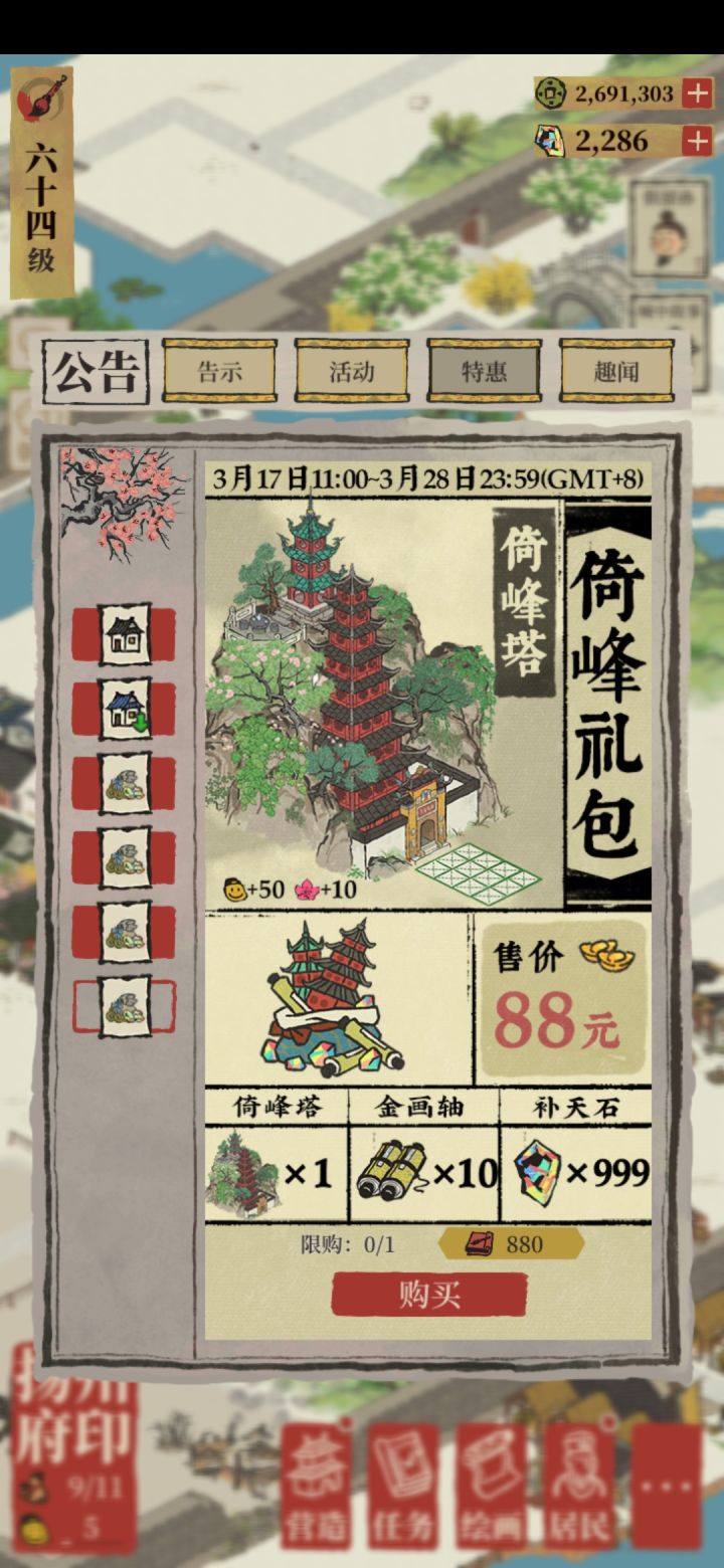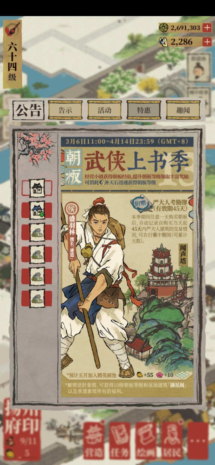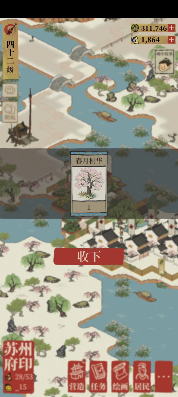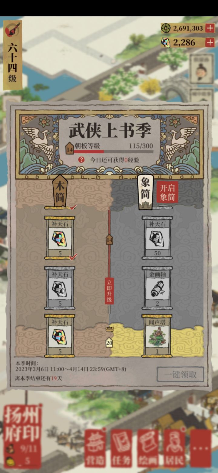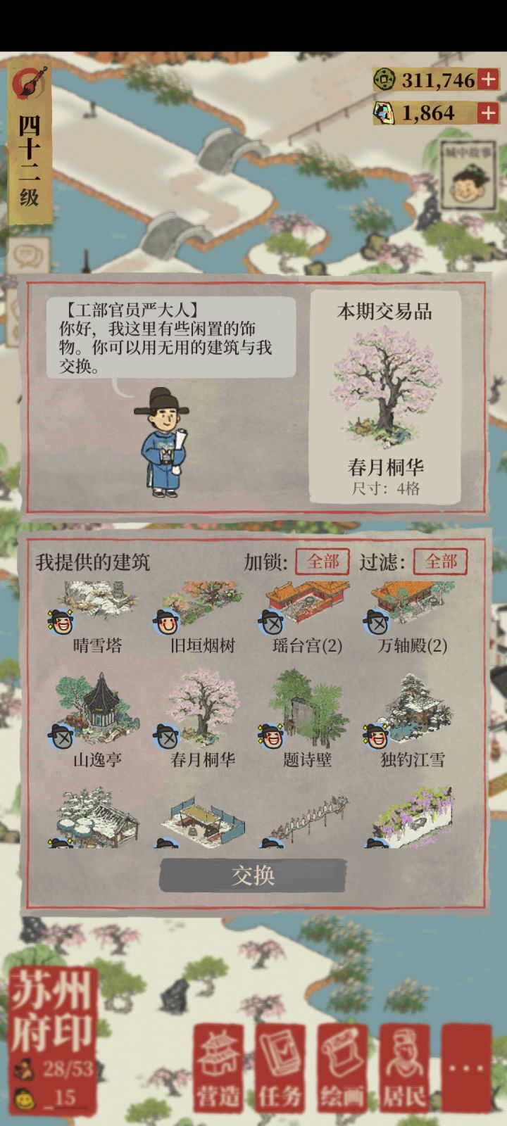 今天宅邸书信告诉我,有位尊贵的客人想看到节庆有余套装,但是那个桌子升级要75个红木,臣妾实在凑不够。开了一个装修百宝箱, 也才59个红木,还差16个,不确定2天之内能掉出来。毕竟我只有1个建材商栈。这时候第一反应就是,再搞一波家具店瓦片点花窗店,一天之内都升到4级,搞个新的建材商栈,明天多一个人刷,说不定还有希望。已经盖了俩商店了,才发现没必要这么折腾。通过商栈轮作,理论上可以同时获得5个