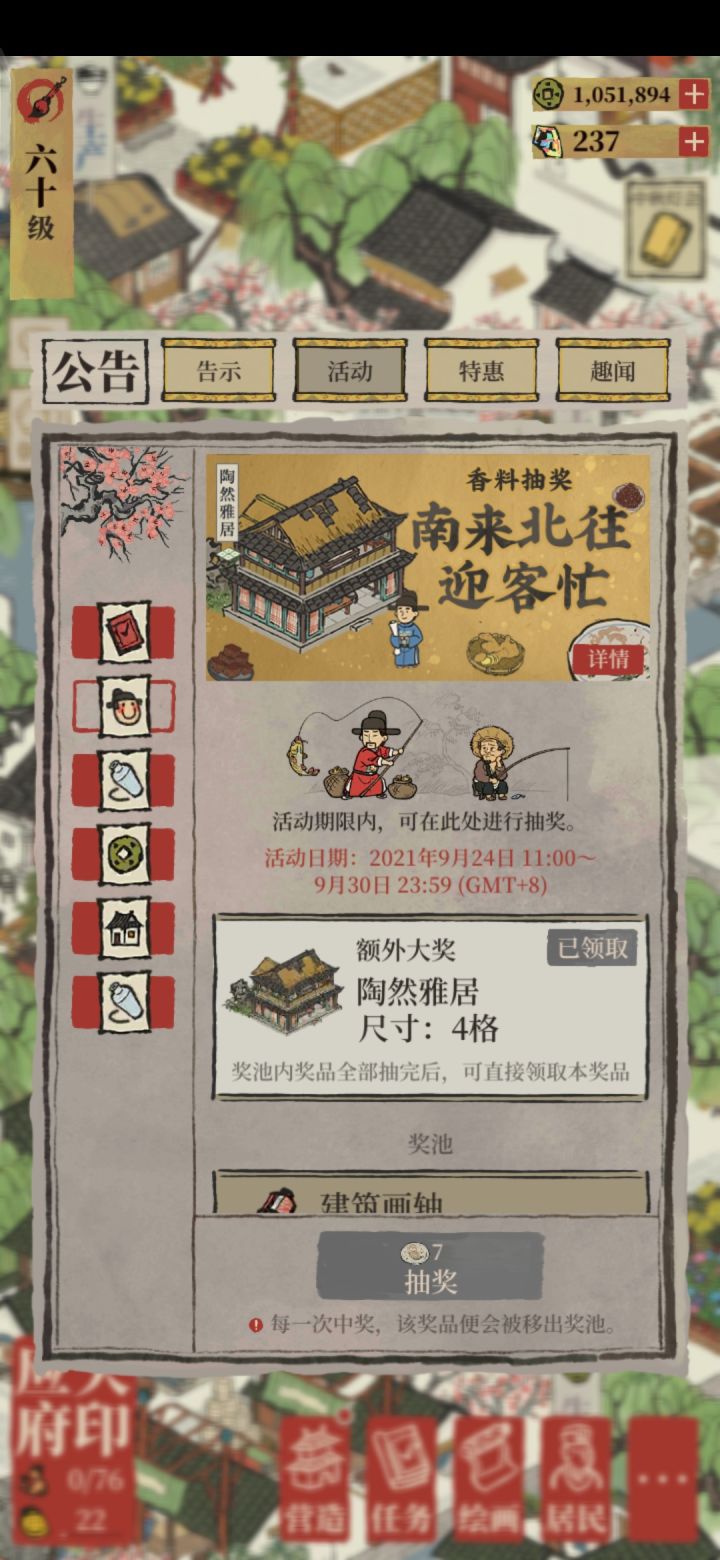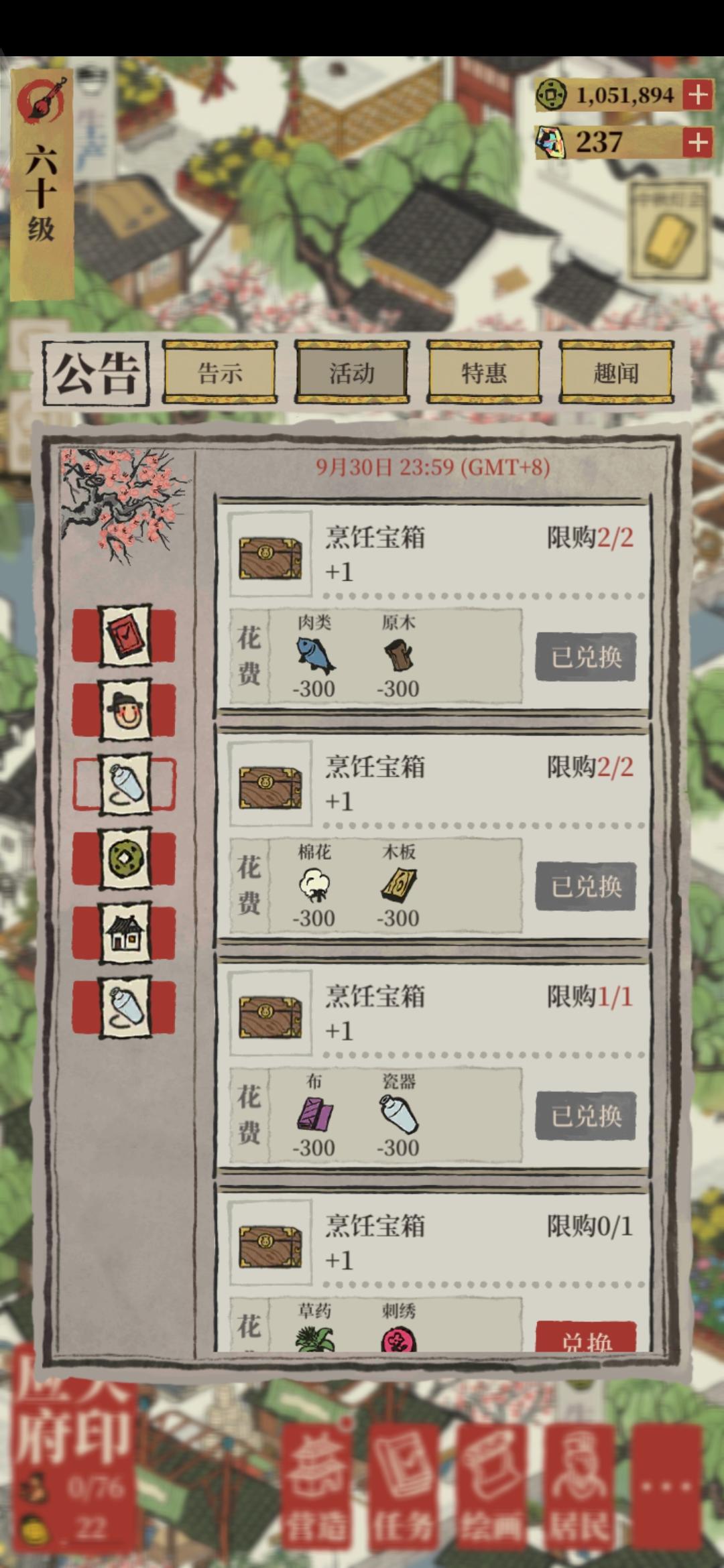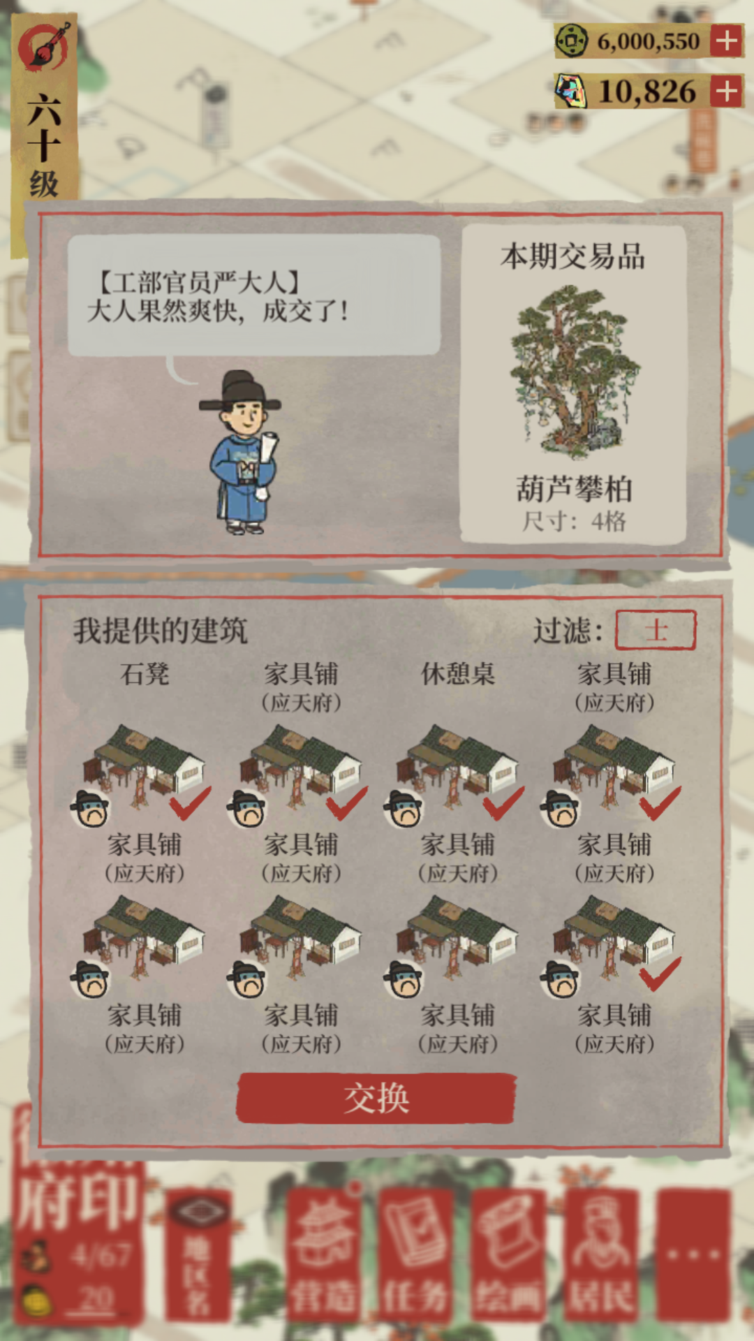 平时不记得去酒楼换调料,这次要用时调料严重不够,花了600肉肉、600原木、600棉花、600木板、300布、300瓷瓶,才换了一个“陶然雅居”,也可以了,开心!