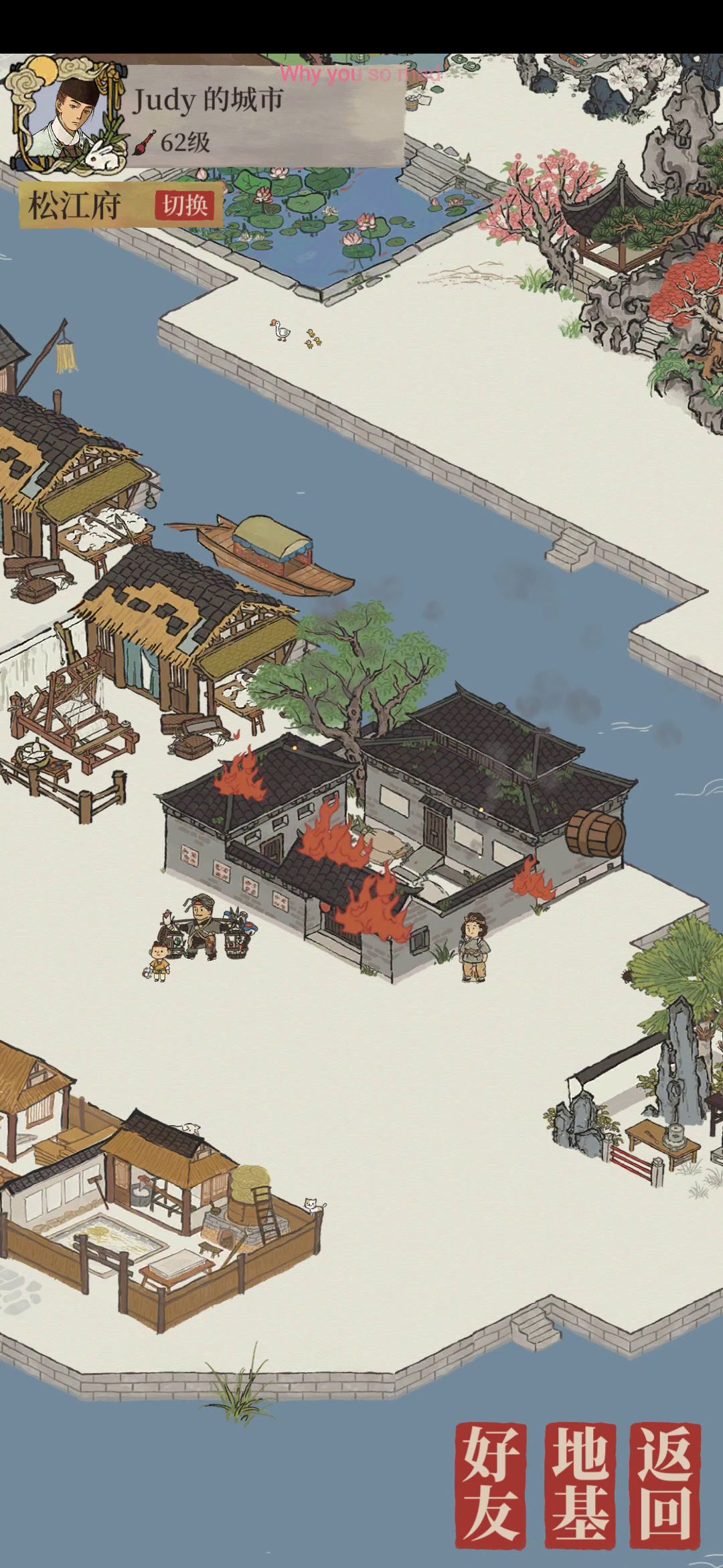 好友家着火了,只能干着急吗?看见三个居民在往里倒水,完全没有效果,能不能开发一个功能让好友帮忙灭火