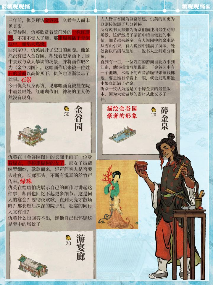 1️⃣繁华事散逐香尘,流水无情草自春。日暮东风怨啼鸟,落花犹似坠楼人。2️⃣江南百景图中的建筑【金谷园】原型即为明代仇英所画的《金谷园图》中的主要建筑。3️⃣创作提取了画作中青铜器中的红珊瑚、石凳、白玉花坛、廊亭挂落、廊亭屋顶等进行二次创作,同时建筑中融入新的故事,园主人石崇化身游商,甚至花重金买了仇英的《金谷园图》,就挂在金谷园中……这也算是跨时空的相遇吧…… #发现好游戏 #游戏日常 #