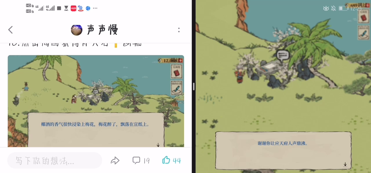 今天下午的时候把一周年的限时探险做完了,跟着攻略找彩蛋的时候,发现了一个彩蛋中的彩蛋。 在梅园这里,上交椰子酒之后会出现几句话,然后我听到了背景乐,觉得还蛮好听的。 小破图的背景乐做的不错哇,我喜欢😍😍😍😍