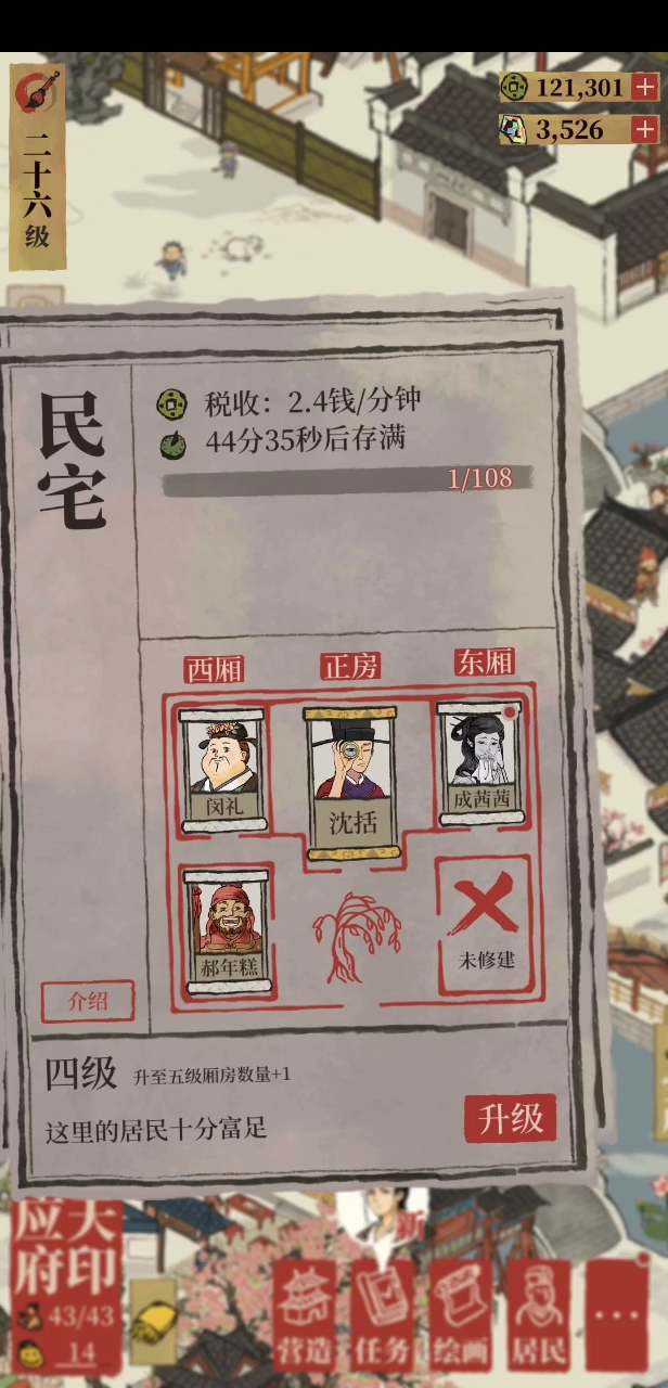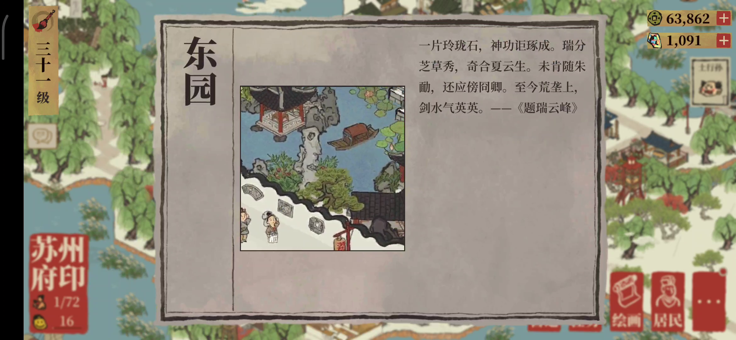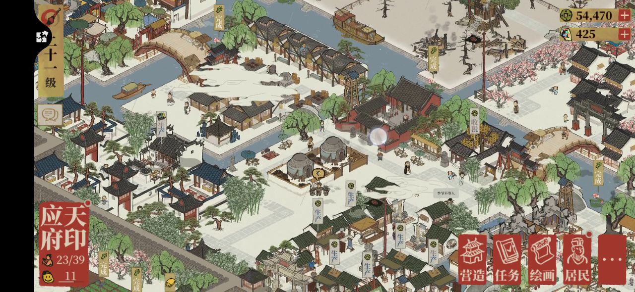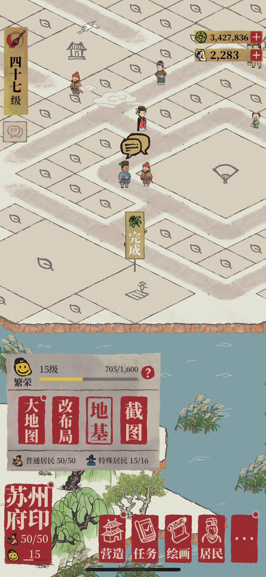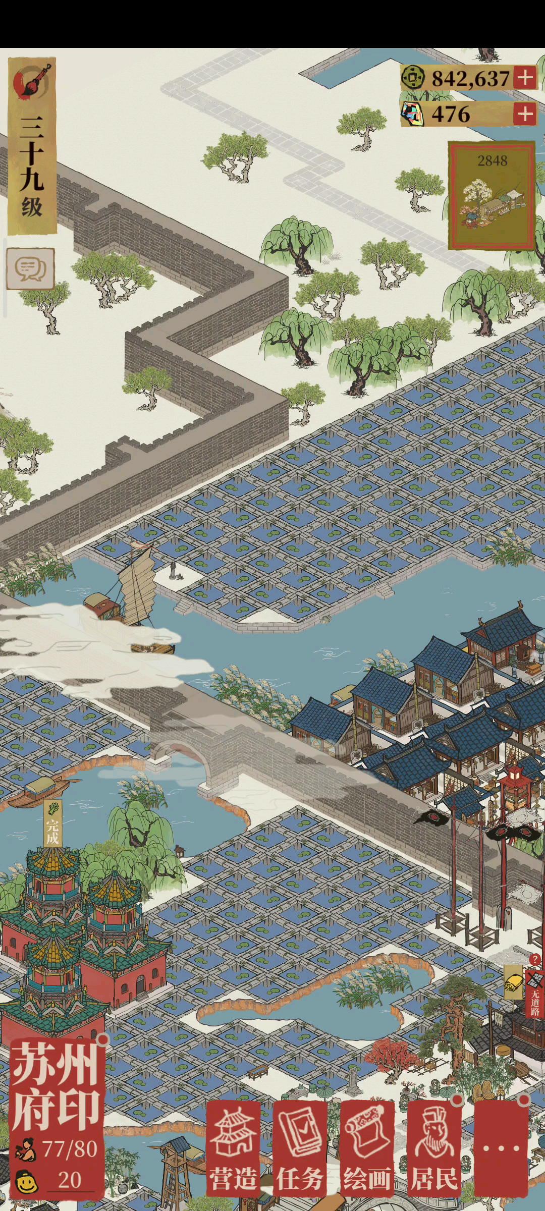 苏州 摆满了水渠,39级娱乐建筑全满,加上一些严大人换的小物件,勉勉强强凑够了20级繁荣,差2200经验升到21级。目测四十六级娱乐建筑全满,满屏树能凑够21级就不错了,,摆时还好,拆到崩溃。。。