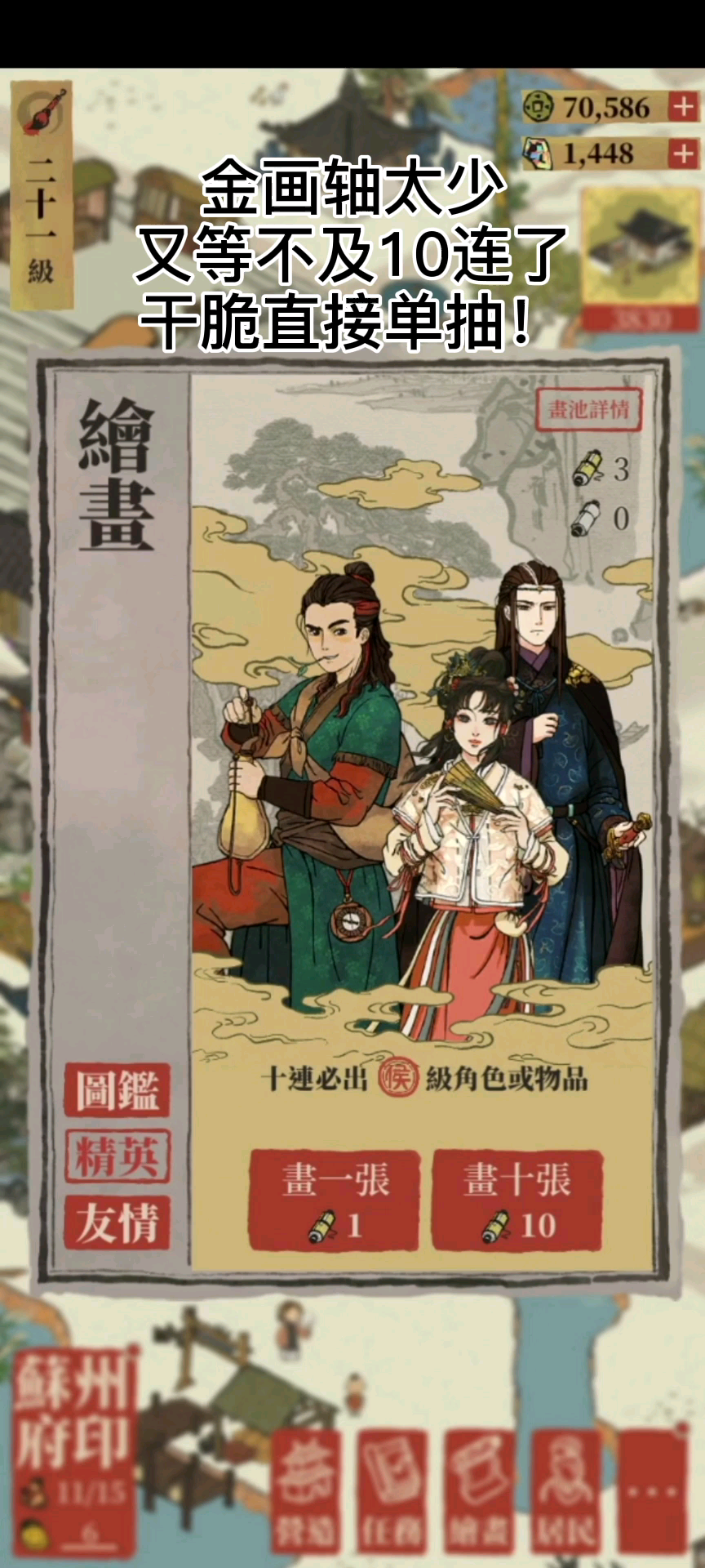 十连抽,可以多画些与人物相关的特征,唐伯虎是我画那个花出的