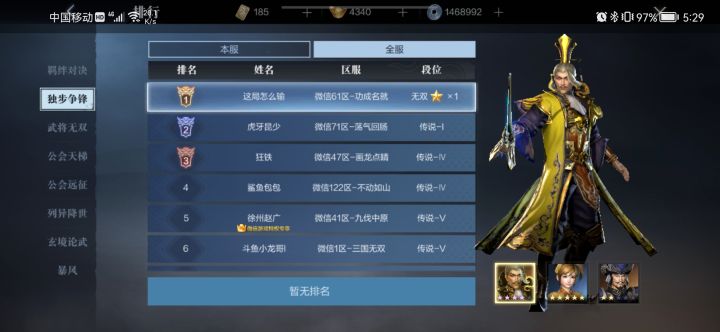 竞技场街S1还有3天结算,目前全服只有一个无双,我们单服只有3个猛将以上,你们真不觉得自己游戏设定有问题?奖励不想给可以不发的,搞这些恶心人