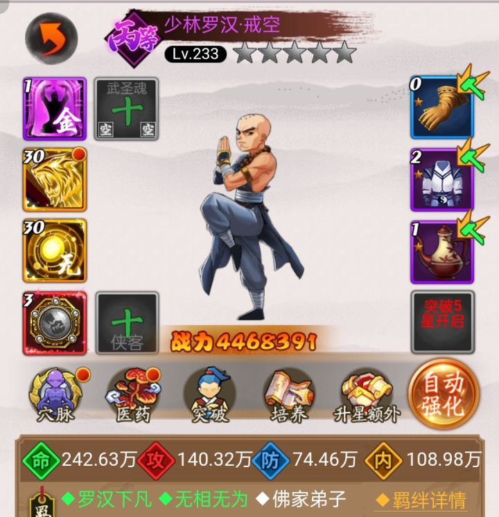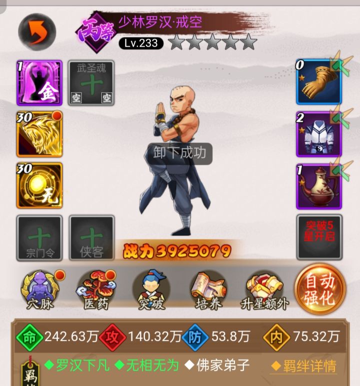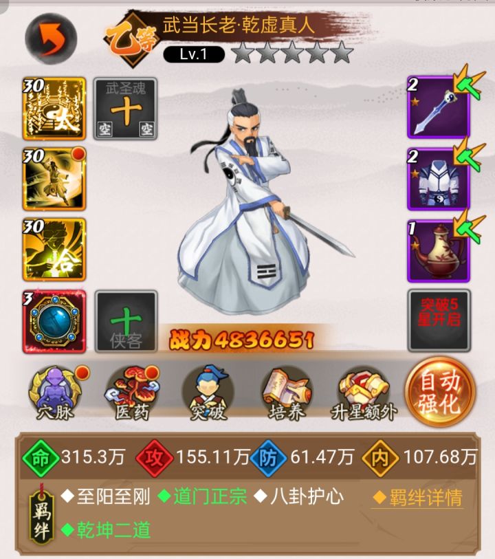 因为丙和尚有60%内力羁绊,带宗门令收益极高。乙武当虽然只有30%,但剑宗门令给的生命,可以用于拼内力是实用属性。所以也可以上宗门令(如果你带上之后内力占比低于21%的情况下,就别带)。还有一点老区的细节,同系掌门别带武圣魂哦,不然也会加属性影响占比。