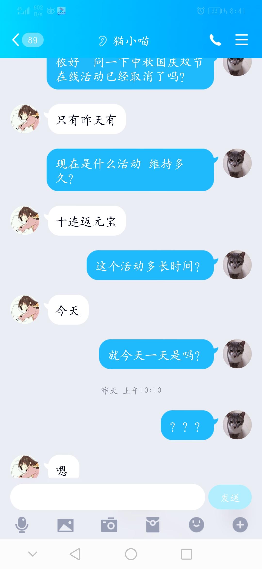 10·1中秋双节当天有在线活动 第二天没了 官方也没有通知就一天 然后出了10连返元宝券活动 第二天我去问官方客服 10连返元宝券活动多长时间 她回复我就一天 我以为官方活动都是一天一更新呢! 寻思着现在不赶紧10连不就亏了吗? 但是今天这活动还在继续进行中 想知道小姐姐为什么要欺骗我 小姐姐这样让人很难信任官方给的答复了 ps:这10连返元宝券的活动具体多长时间啊! 最后祈愿一下 能过一下心