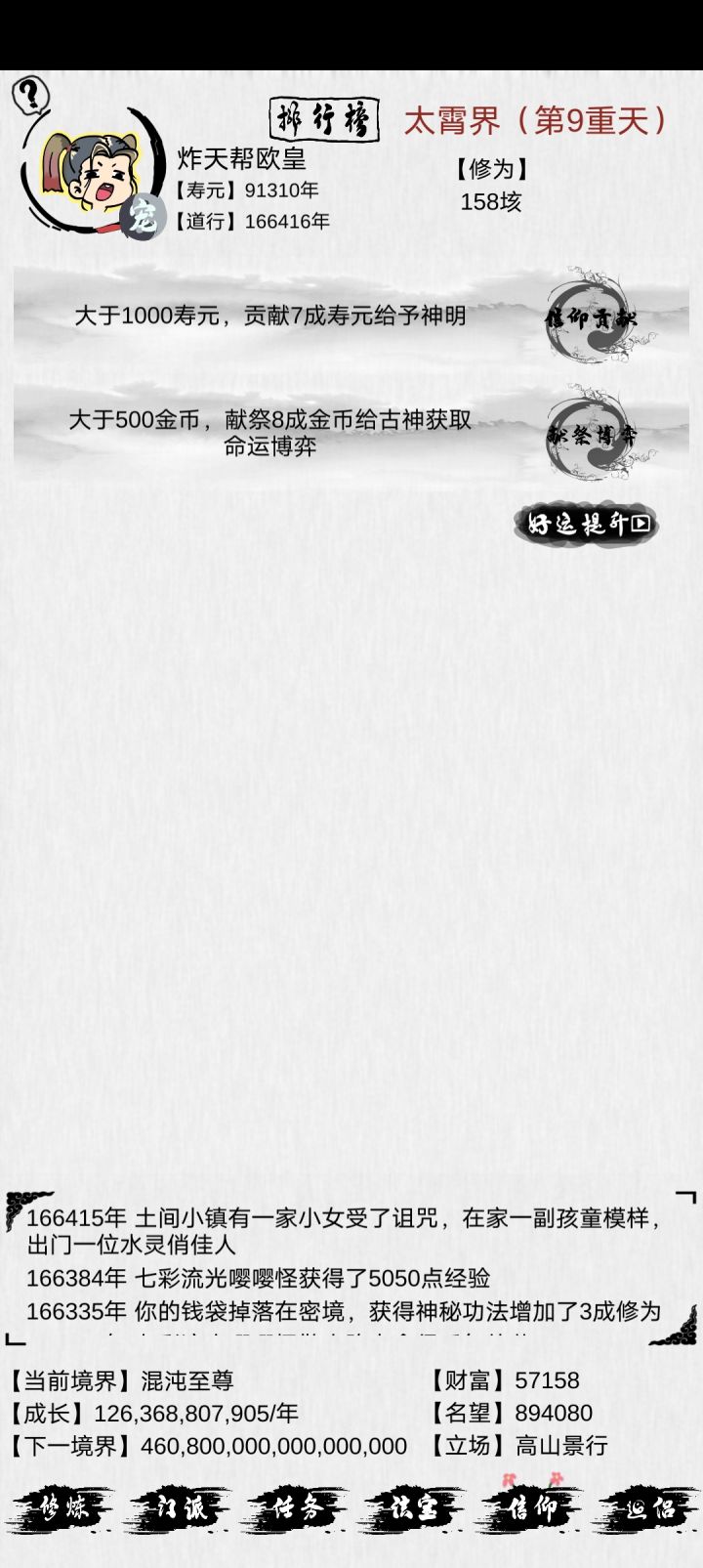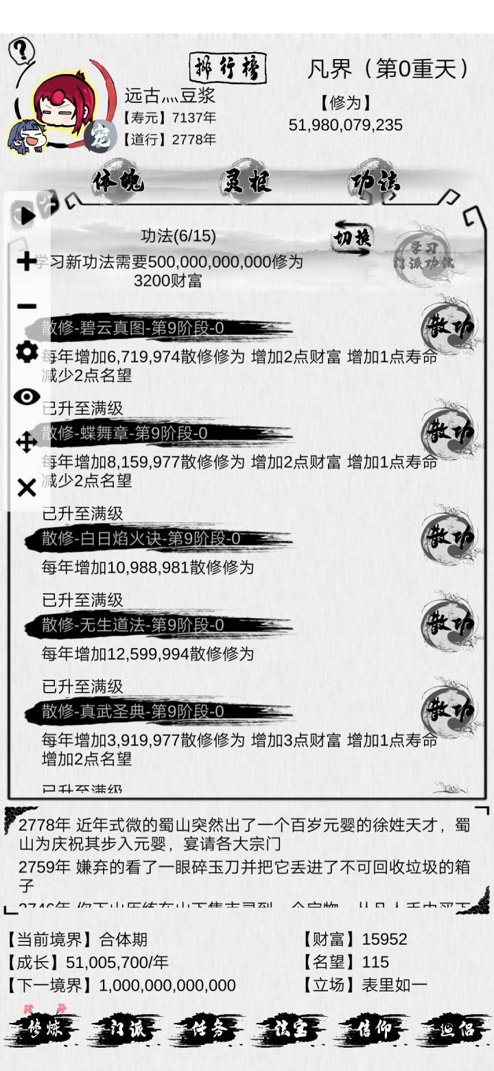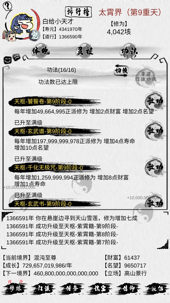 我想许多玩家一开始肯定不知道怎么玩,会卡在某一个境界不到。其实每到一个重天的时候一开始就用手指头的屏幕得修为,我一般都用右手的四个指头一起点,推荐多指头点。开局先升一下体魄和灵根,一开始门派只用等一百年,先顺便加一个门派(如果一开始刷出了5级门派就去,我不推荐萌新刚刚开始就选择邪,推荐正教,正教相当于邪容易一些)。玩到0重以上的话就可以刚刚开始就可以一直等5级门派,因为到0重以上寿命就会一直加,这