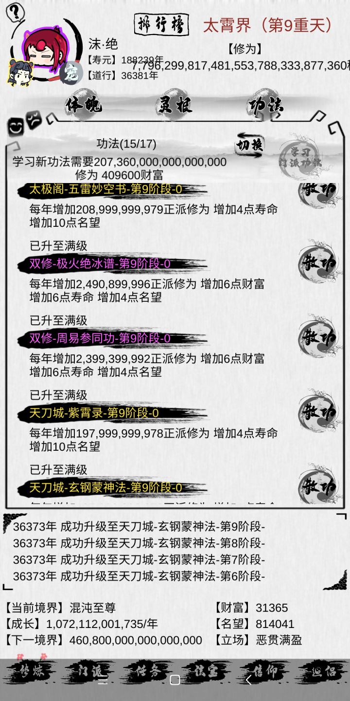 自我摸索速成攻略①寿命。刚开始玩,寿命是有限的。所以我们必须把寿命堆上去。但是别太害怕,每突破一个境界,是有寿命加成的。貌似是一千多吧。有的功法也加寿命。但是比较稀有。大部分的宗门都会加寿命。一部分法宝也会加寿命。不过寿命增长最快的途径还是祭献。②功法。个人推荐前期修为能点到就先把功法学了吧。第一有是财富属性功法那就最好了。如果是减财富的话。。。刷脸吧。。。不行就重生。要么就多肝好多好多天。飞