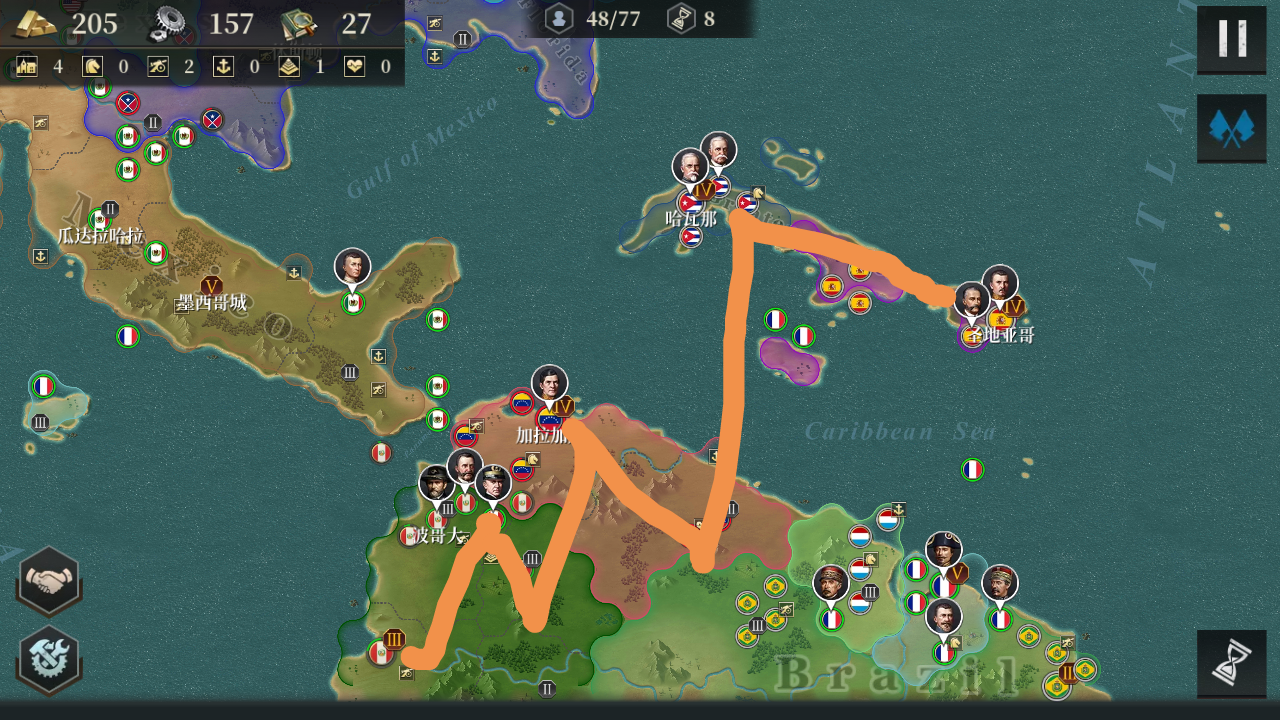 开局外交法国🇫🇷,可以拉一下英国🇬🇧,让法国火星兵打西班牙。上边是大致路线,先打首都,可以降士气。灭了南美俩小国,可以挂机打钱了,也可以打西班牙,那样就不用拉英国了,注意美国🇺🇸,它不行了就多给他打钱。 然后就躺吧。 明天水巴伐利亚攻略