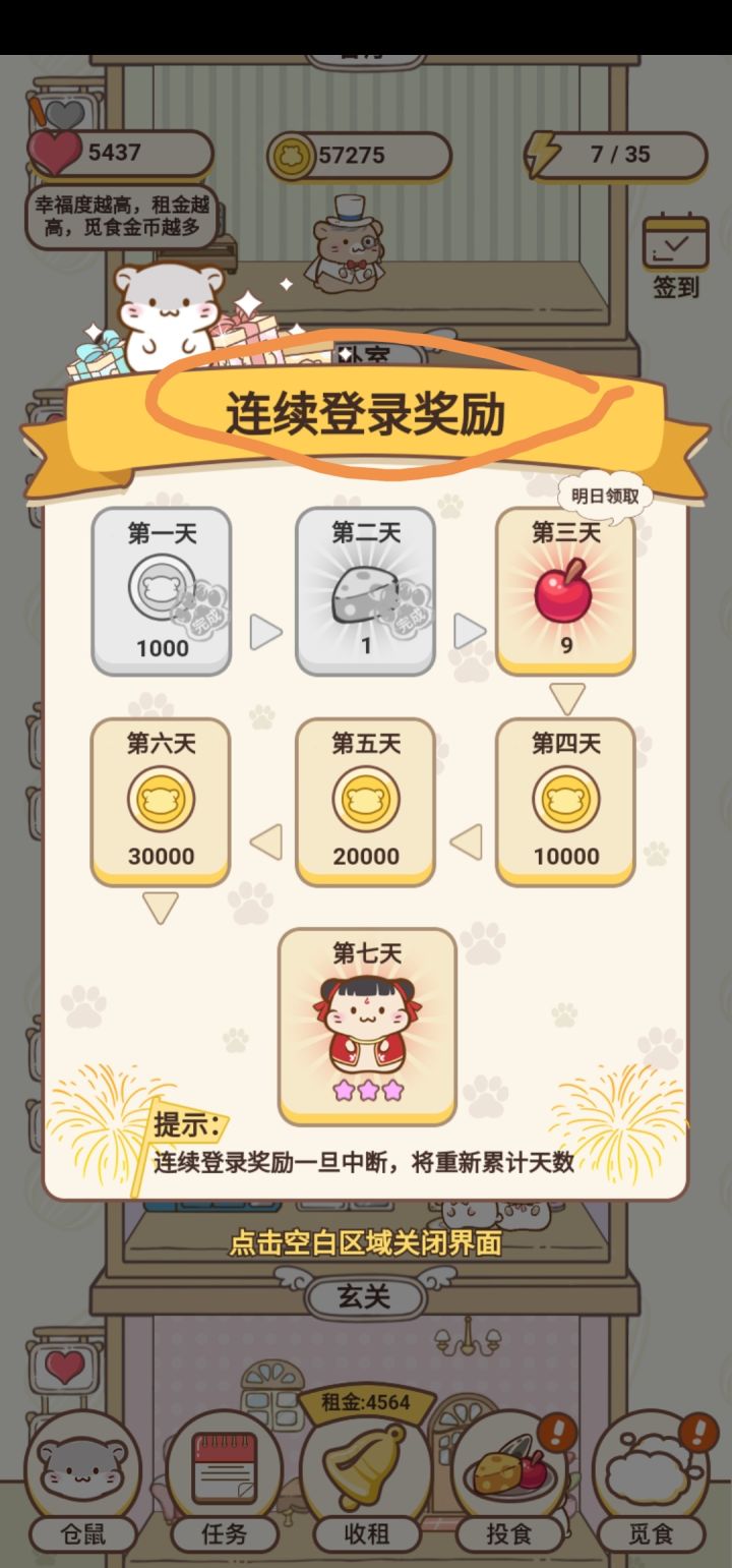 有几个小技巧要分享!1.每日上线签到2.一定要分享!因为目前还不能分享链接,所以就等于连续点三下就可以获得金币!3.觅食:没有苹果,瓜子,气球的方块尽量不能去碰,浪费精力,有气球的时候直接点气球就全部消除界面的障碍物啦!