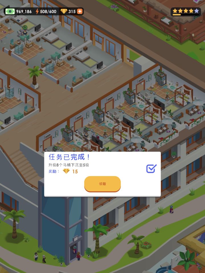 我单独升级完所有房间的马桶都无法达成这个任务,但是当我将五间房间都升满至100%的时候~任务就自动达成了。我也觉得不可思议…但应该能帮助到你们。我升级的房间是:套房4间,朝海的双人房4间。