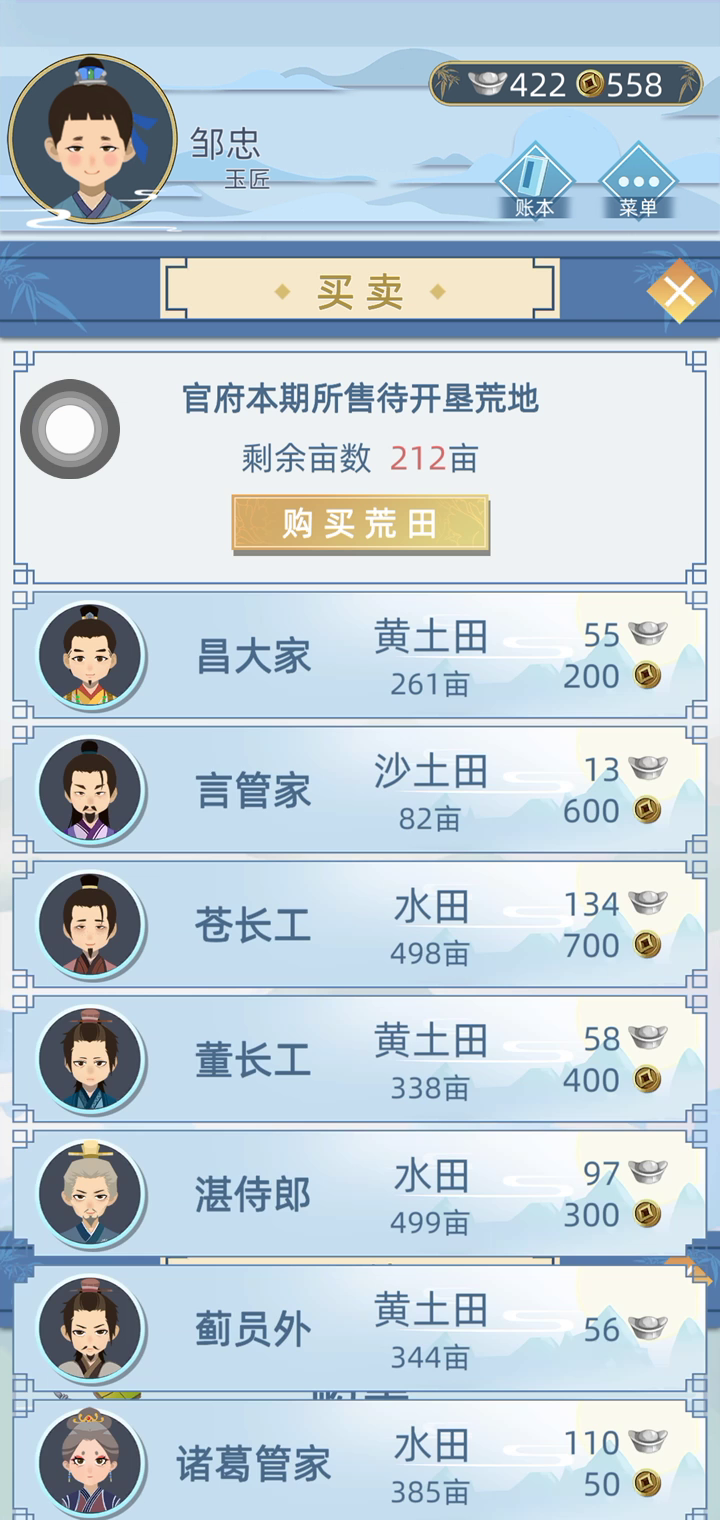 玩了几天了发现个技巧分享给大家,如果前期抓蛐蛐没有积累一定的财富,比如就1到5金的情况下,可以别急着种田,正确的方式是买田然后卖田,比如水田李员外卖单价100银一亩而王老汉卖水田60银一亩,可以先买李员外1亩水田,反手把剩余的钱全买王老汉50亩这样你把田卖了,因为你先买的李员外的田,系统默认你买的51亩田都是按100一亩,这样你会赚40银的差价,反复这样操作钱就大把大把多起来了,买完了水田再买其他