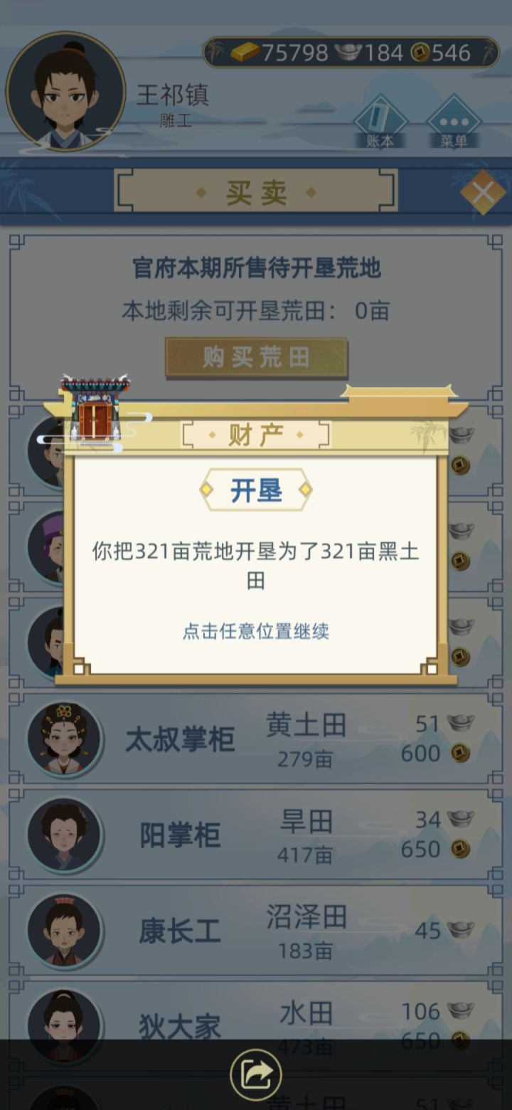首先,找一块最贵的田买下,然后买其他便宜的同样的田,有多少买多少,然后在卖出去,价格会以最贵的来卖,日入万金,400银倒了十来手,就翻到8金,还不用下一年