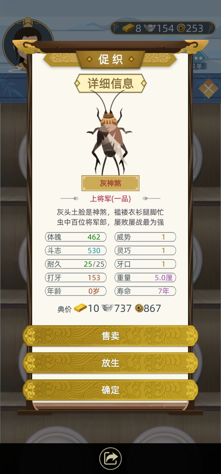 说一下,玩这个游戏的心得1.一开始只能向父母和亲属交流,等可以要钱的时候,一定要要钱,钱的多少跟父母的经济有关。2.可以抓蛐蛐时,先去杂货铺买罐子,之后抓蛐蛐,蛐蛐叫声颜色分的黄的一般是4到8品左右,紫色的1到3品,白的不用理,在开局看看能不能弄到三个威慑10的蛐蛐,有的话可以去打府赛,赚250两3.刷客栈,和书生类的聊天加学识,和年轻女性聊天加魅力,和侠客聊天好像是加体魄,不过没必要,一般