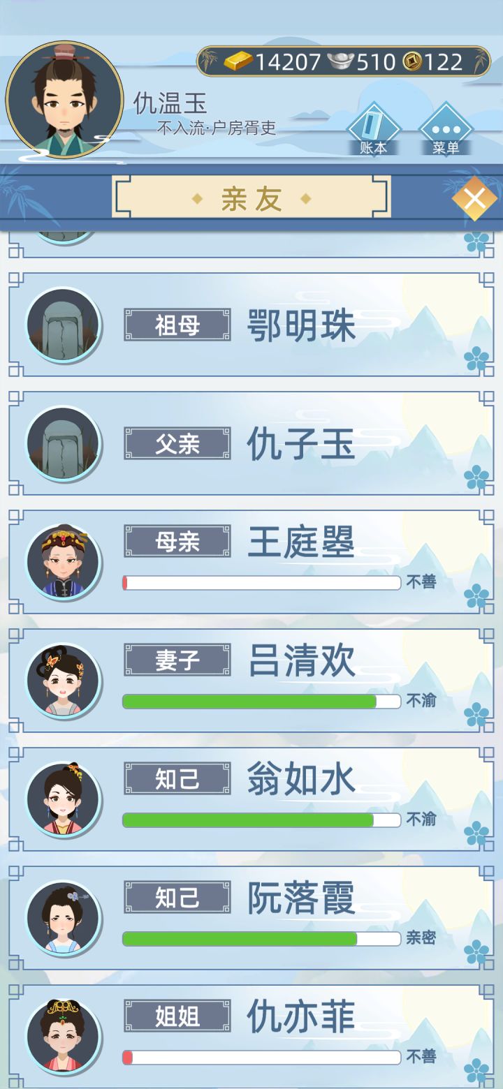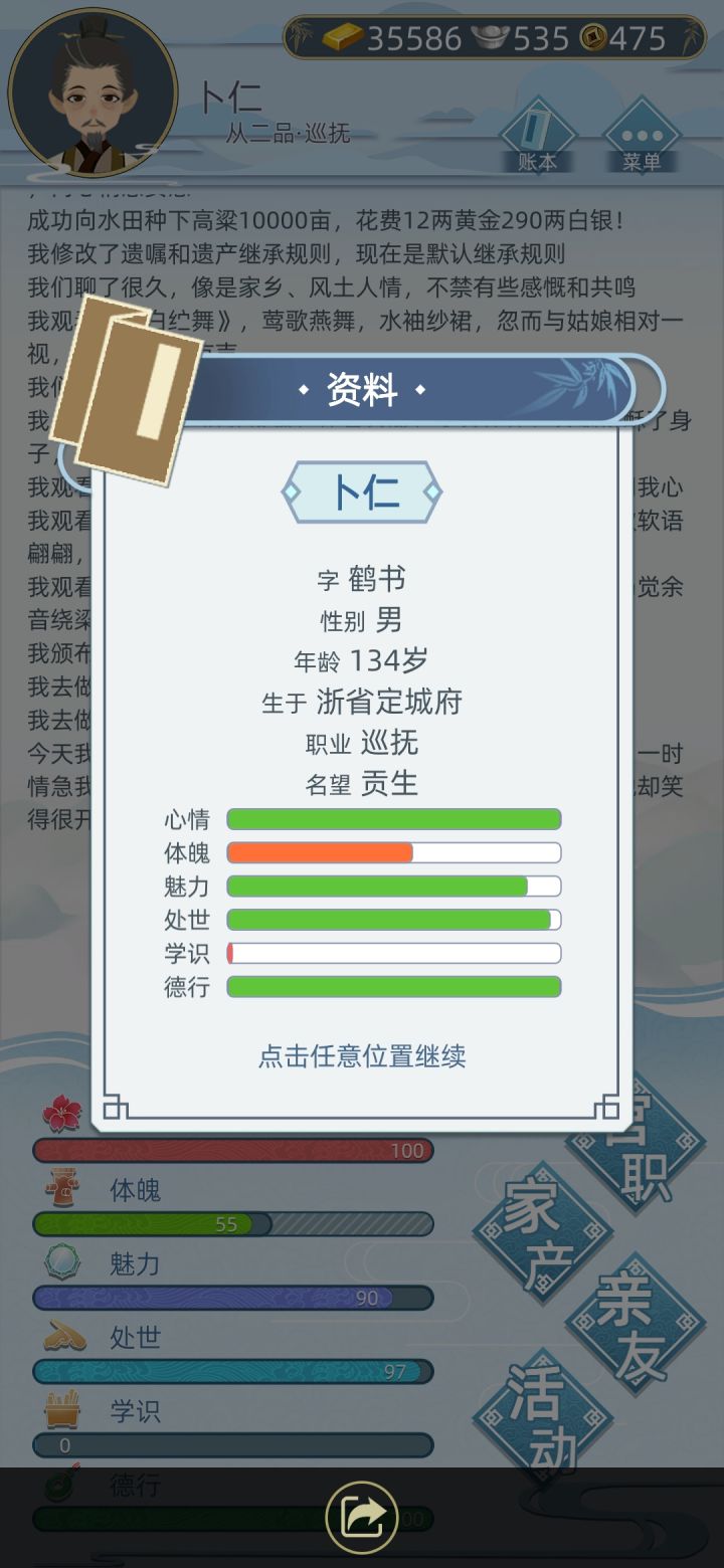 超级攻略来了…………从出生到富甲一方还是有点意思的这个人物活了91岁当过官儿二品巡抚大人,做过大玉匠,还种地,娶头牌老婆,生漂亮儿女。好不美哉,有钱💰有地有车一族。萌新看过来前期刚出生等长大一些可以先问父母要钱,然后买促织罐抓蛐蛐,品色越好卖的越贵,有1-2品赞满三个可以参加大赛赢黄金,不够就卖掉赚钱。玩法:打工 做官儿 种地每个人物有6个属性。增加方法如下(心情:医馆大保健一条龙服务还增加体