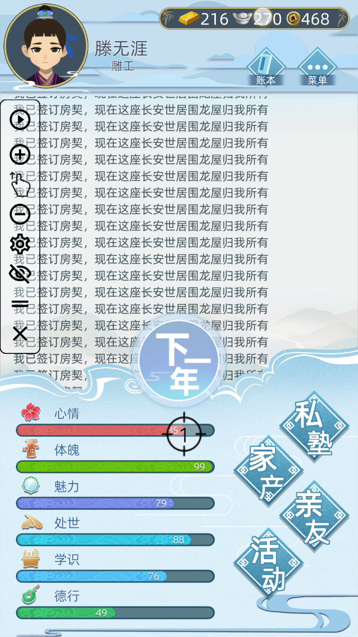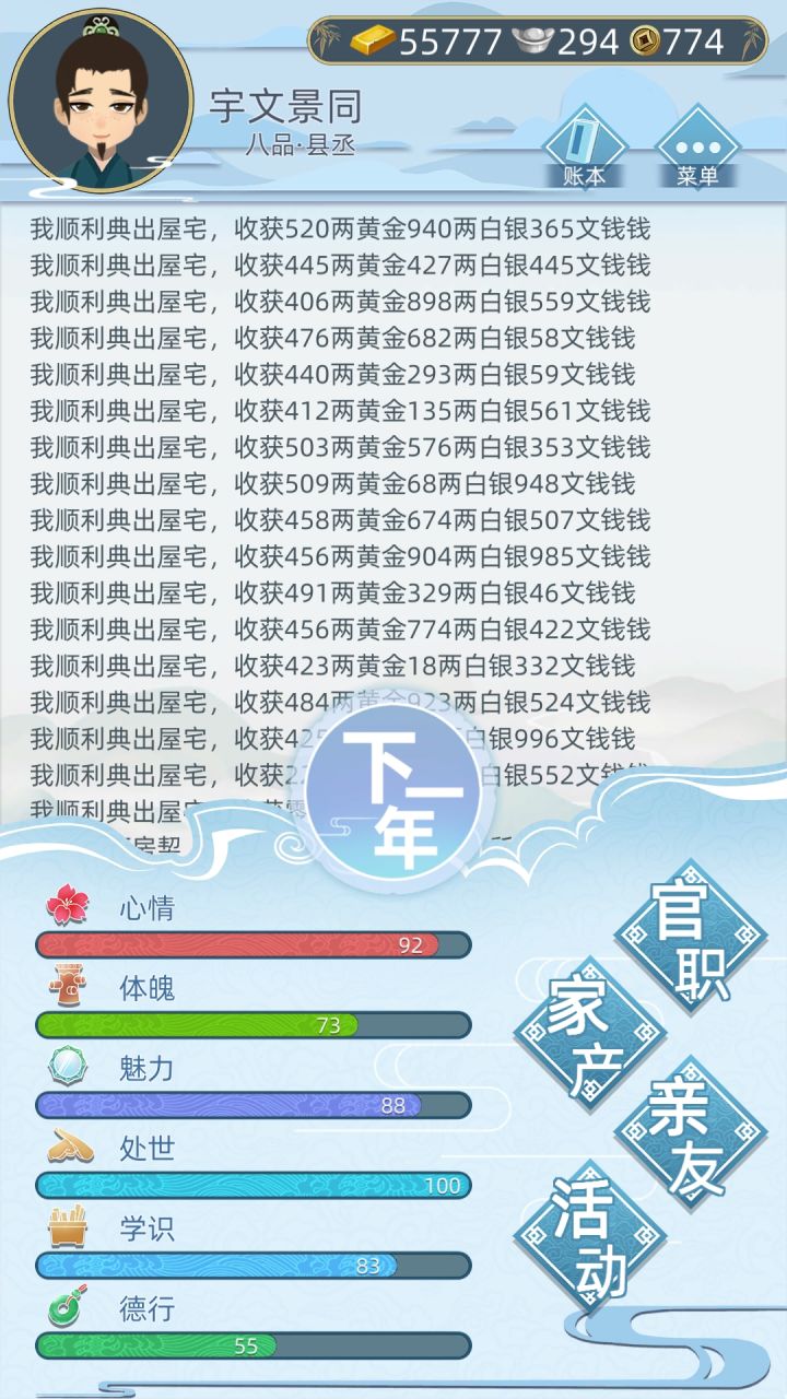 各位如果想要好的开局,建议要完钱以后买抓蛐蛐的碗,然后去抓,你只需要看看哪个叫声的符号比较大就可以抓住贵的,然后参加比赛,就可以获得大概200多银子。在拜寺庙的时候看见如来就点,别乱点自在天和丧尸的那个。娶妻子的话可以自己花钱喊媒婆,不用在意游戏里父母的感受,反正后期自己会满,而且想生孩子的话可以多点几下生孩子,就是会伤体力,恢复体力可以去射箭,选左边的那个,命中红点得五个三十分可以恢复10点体力