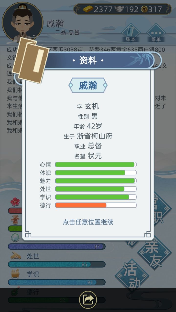 玩了一下感触挺大的,仿佛人生如梦,一下子走完了。-----------分割线我哥小时候蛮帅的,后面堕落了然后我娶了个美妻,生了个靓靓的女儿接着由于我忘了给我女儿安排婚事,她后面自己找了个,然后我瞎了,然后成了我女婿,感觉和孟浩然有啥关系后面慢慢老去,有了看起来傻乎乎有点蠢萌可爱的孙女我和妻子也慢慢老去,但她美如依旧,一生陪伴,我没去寻欢作乐,安静当官然后我挂了,如果妻子比我先死我可能