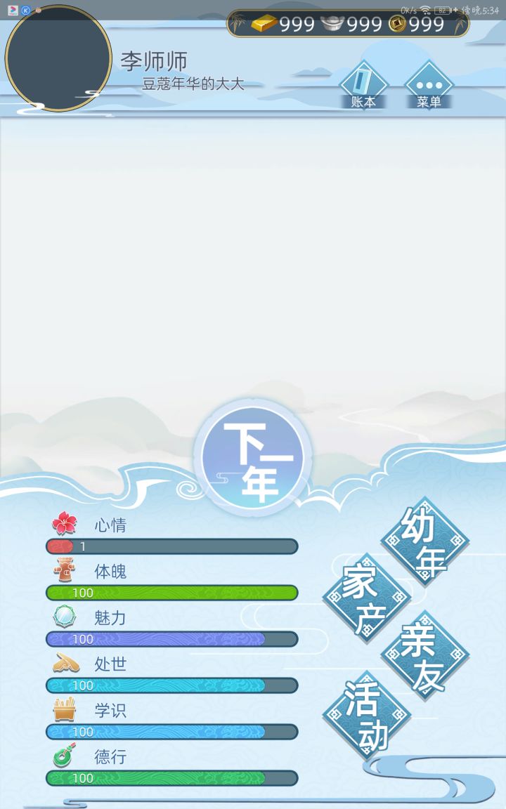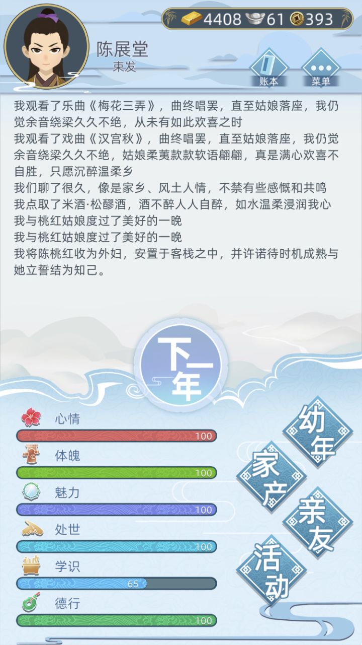 我觉得可以新添一个道士线,进入线路可以靠机缘或者自己主动拜入(几率)。融合一下道教文化会很不错。而且这会变成一条男女通用神职线路。女子线路也可以用宫女,花魅等等来丰富。皇帝线可以注重于决策并且规则可以参照皇权里。分为武将势力,文官势力,民生,宗教,财政,土木,内宫和外患。一个决策可能会影响到一个甚至所有的势力。但截然不同的是,民生达到极高程度不会导致统治者身亡。财政永远不会有上限因此可以相应地设计
