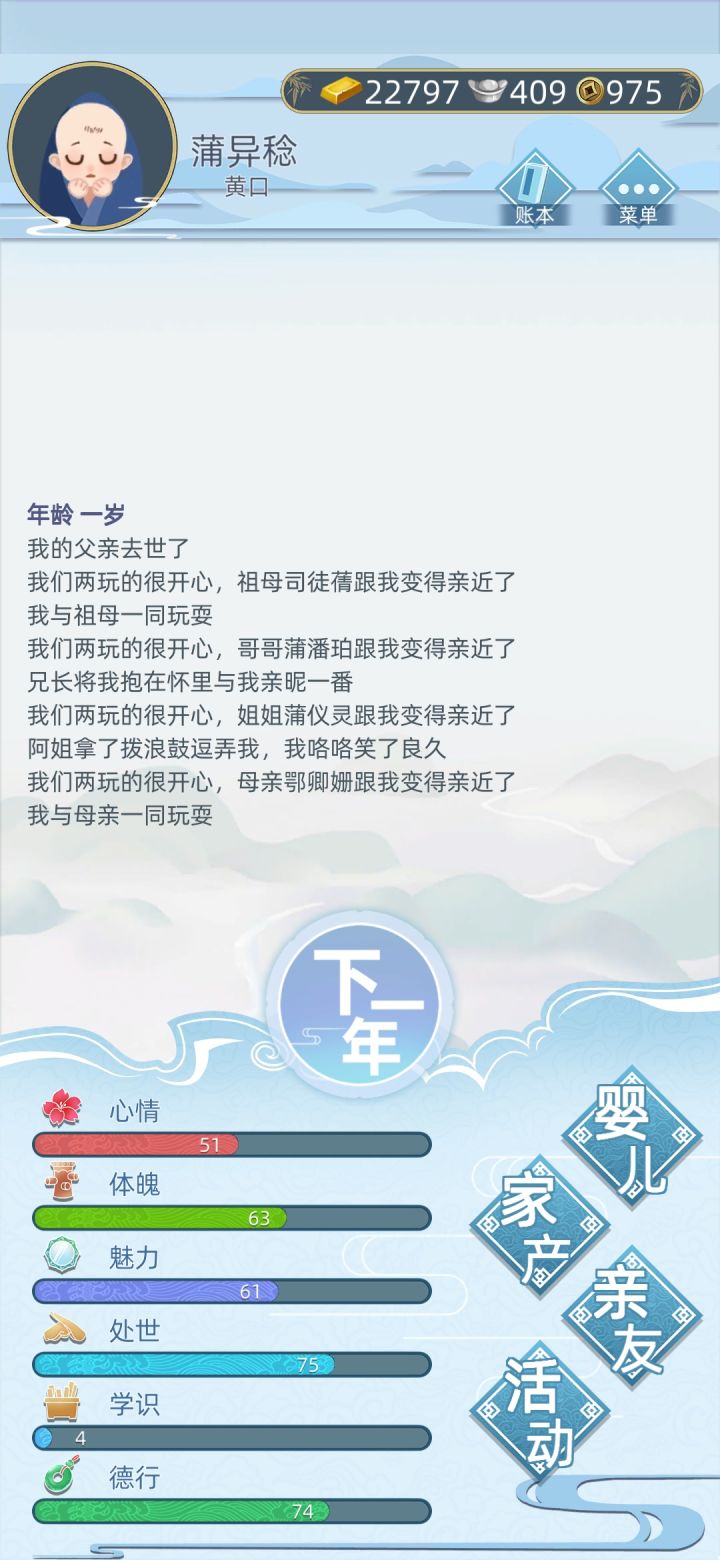 这个游戏主要缺乏联系和整体的感觉,就像钱有什么用?职业和其他方面有什么联系?……就像更多人说的,最完善的就是斗蛐蛐了。总的来说就是每个功能缺乏背后的意义。我对这个游戏的建议是,钱可以看做是对人生更多选择的资本;既然名字叫“人生”最有意思的就是让玩家自主选择,并设定没有绝对正确的答案,比如你考中秀才家族里对你寄托厚望,家族里对你进行了进一步帮助,但等你当官了之后家族里有人要你用权利帮助他们,这其