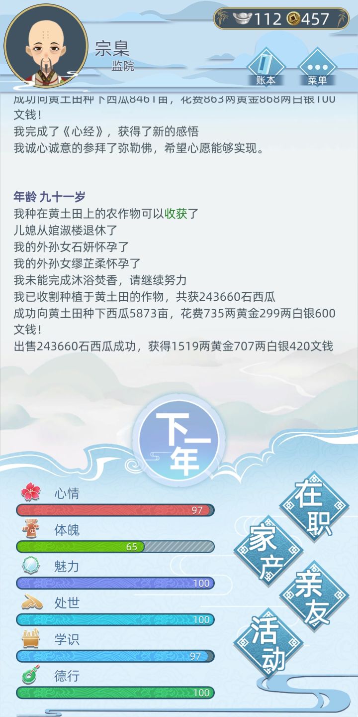 1.后期钱花不完建议加一些花钱的地方比如蛐蛐市场 能高价买一二品蛐蛐 后期当小玩具感觉不错(有几回合甚至懒得动我那几万亩良田)2.有部分内容太过繁琐建议加一些类似一键收田 一键卖农物的功能建议亲友可以分类比如子女,伴侣,本家?(想不出其他名称)这样子会整洁一些(别忘了一键亲近)3.武馆杂市甜水巷内容太过干瘪4.🐴车有什么用?5.低品官职二选一有时限制性太大(我想好好处理政事你她喵逼着