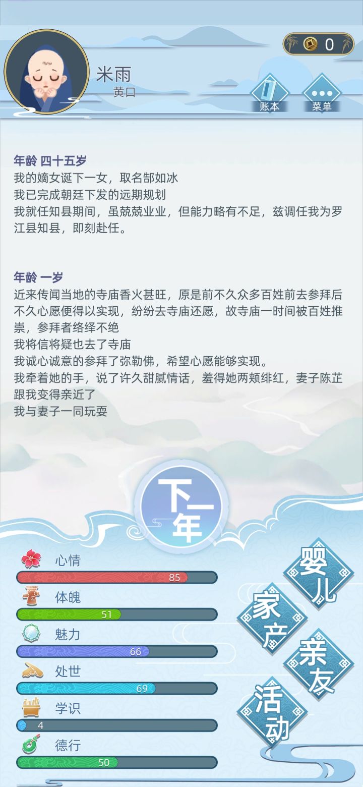 出bug了,继承后一直在学习,一辈子学了62年🙄3个妻子怀了孩子生不出来…继承人上的永远是0岁的不为人知的婴儿,自己不惑之年而自己儿子都八九十岁了…还以为几代人奋斗下来的家产要没了,结果继承成功还能继续玩下去