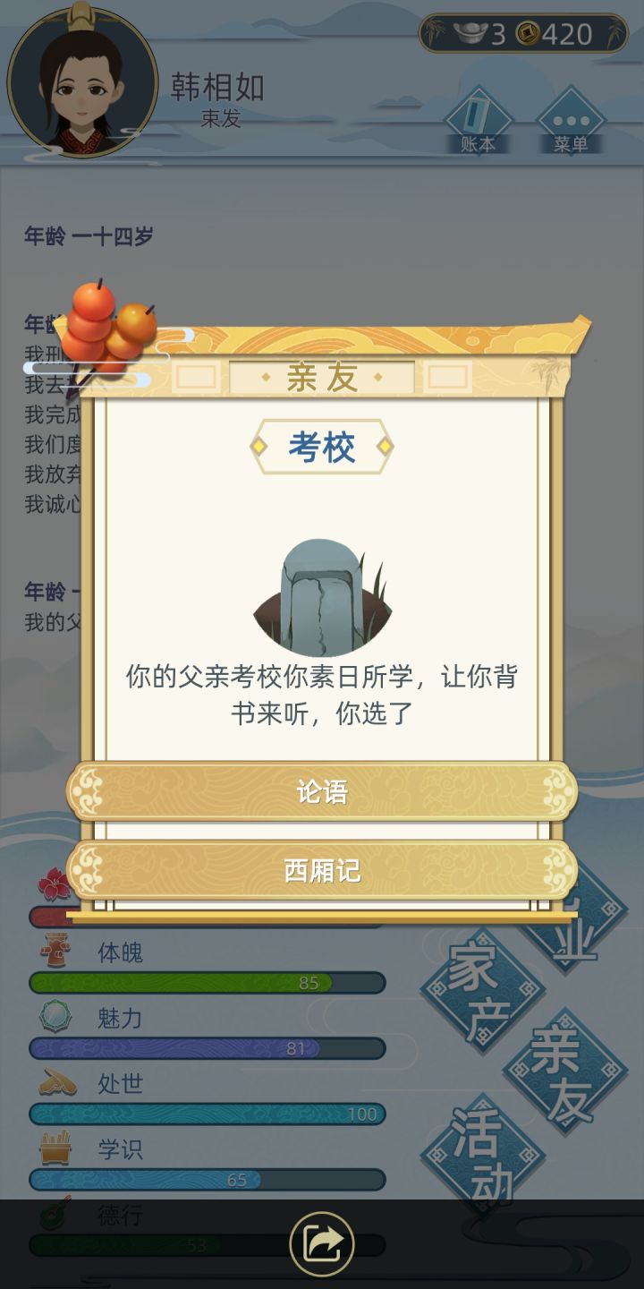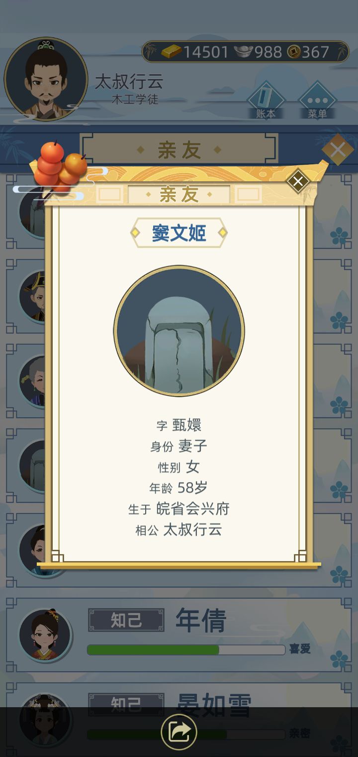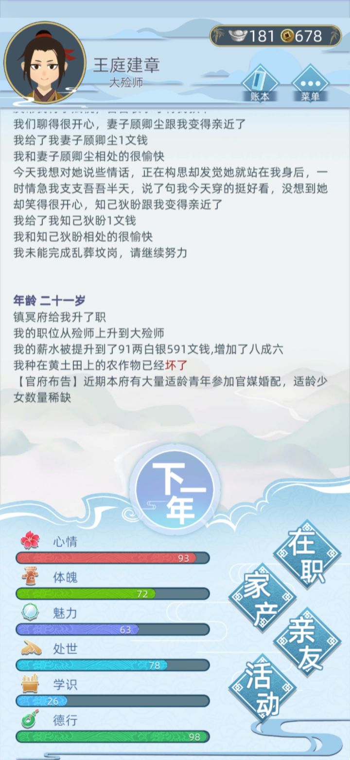 给开发者的几个建议1-娶妾就是娶妾,弄个知己是几个意思,不让生庶子那我花那么多钱娶那么多媳妇干啥使。2-挑媳妇的时候费老大劲了,结果最后一看什么媳妇什么家庭什么身份根本没用?娶个员外闺女以为能对我自己仕途有好处,结果和娶个铁匠女儿没差别……3-买马车的用处是什么?买几十金的宝马车就是每天多扣钱吗?4-打猎系统太鸡肋🐔一辈子碰不到几回贵的动物,打的兔子鹿直接卖了赚那点钱还不如放生加一加德行。
