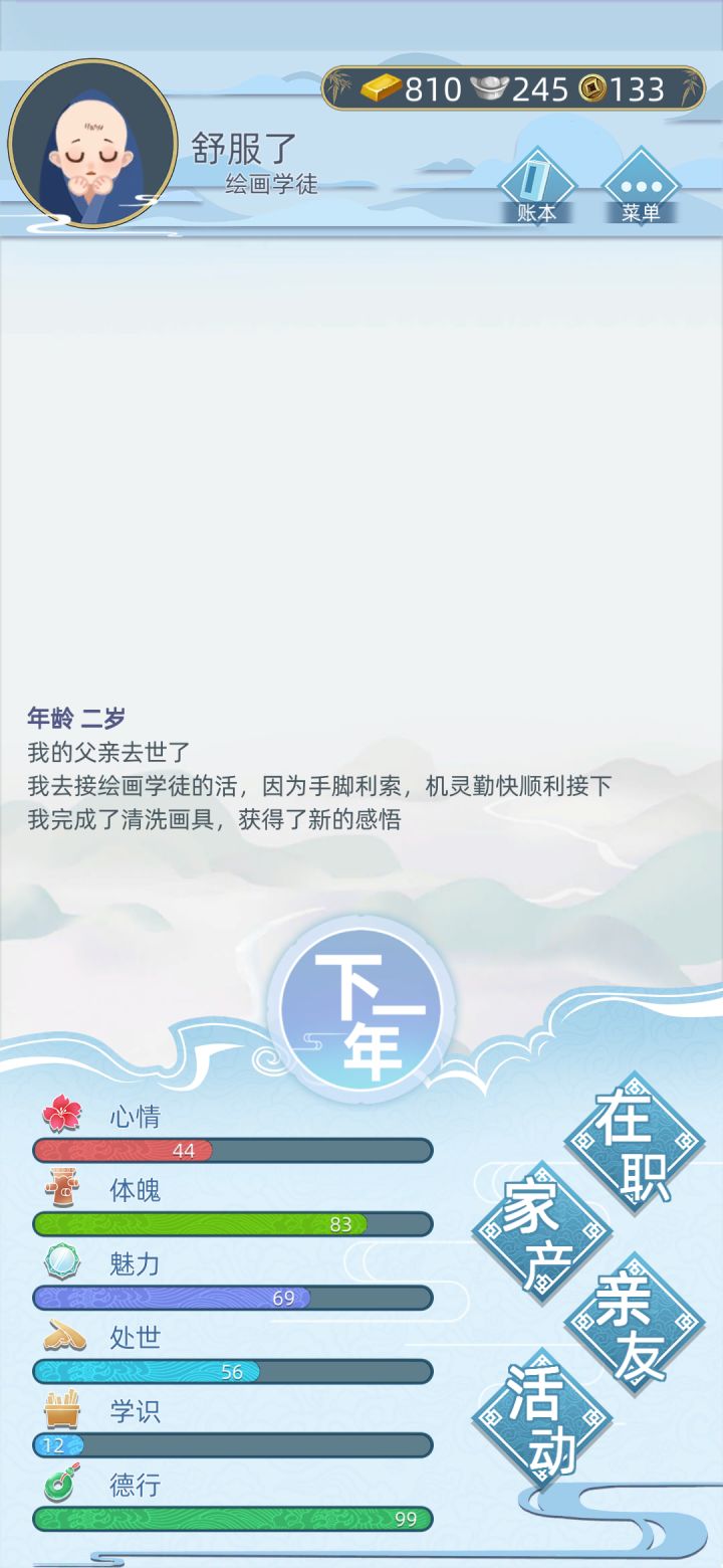 1、一键种田或者按往年播种进行续播。一键收获,一件出售当年作物。种田太麻烦了,每年种七种田,施七次肥,收获七次,出售七次,年年如此种到70岁实在受不了我自尽了。2、在资产以及亲友上给个红点标记,提示一下今年未收取作物,或者未出售作物。3、钱太多之后,给亲友钱不好操作。建议不要用最大值最小值这种。增加数值和单位的按钮(比如xx 金、银、铜)。以及默认按往年情况给。4、增加仕途路线,比如武官能造