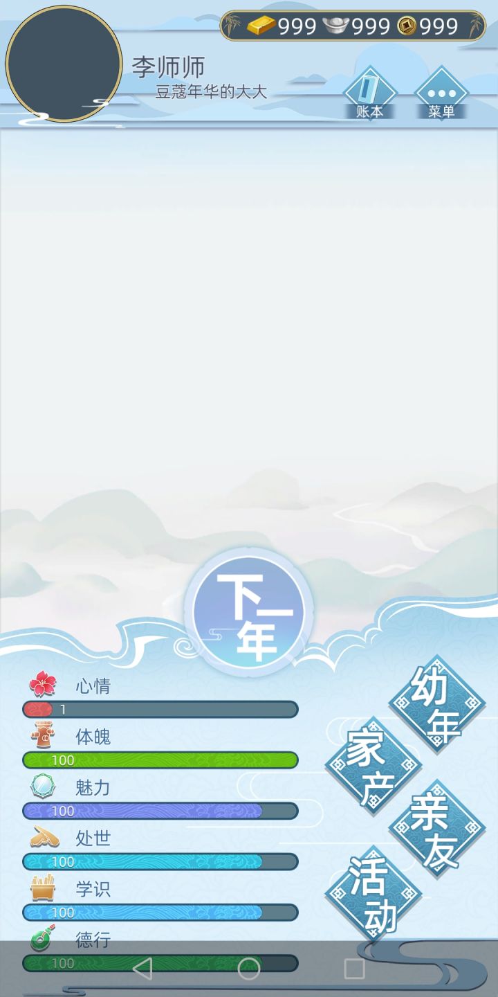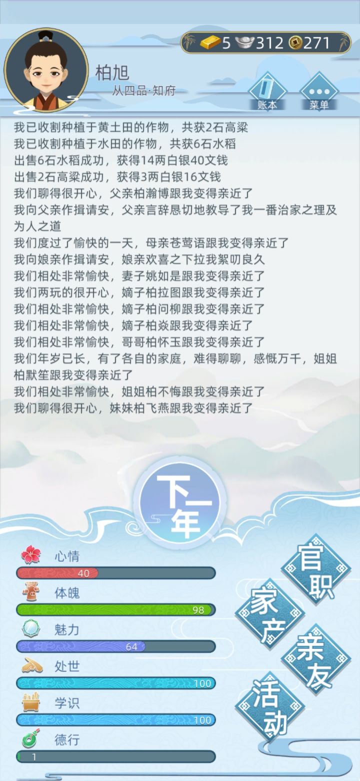 建议贴 !!!!!1开始可以自己设置姓名增加玩家带入感。2父母都50,60岁了还有自己的工作。感觉不好。3可以开发出其他几个城市(比如京城,省城,府城,各个小城啊),玩家可以去跑商贩卖各地特产商品来赚钱。玩家也可以不用总种田才可以暴富,还可以增加游戏乐趣。4城市地图一代开发出来,可以加入很多东西的。以上纯属个人想法