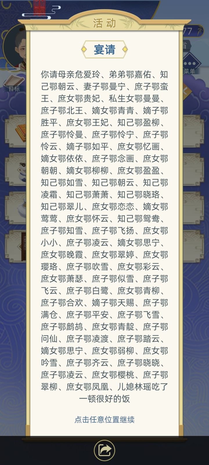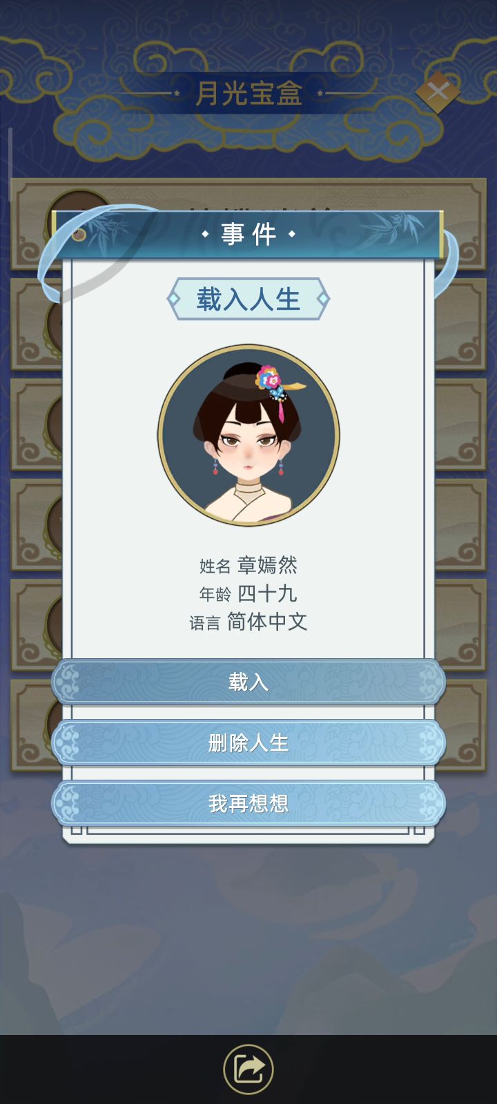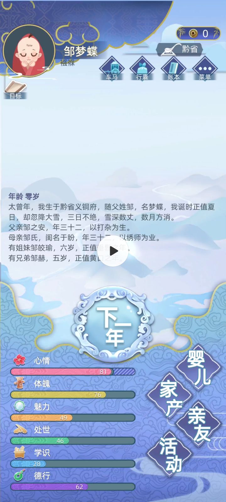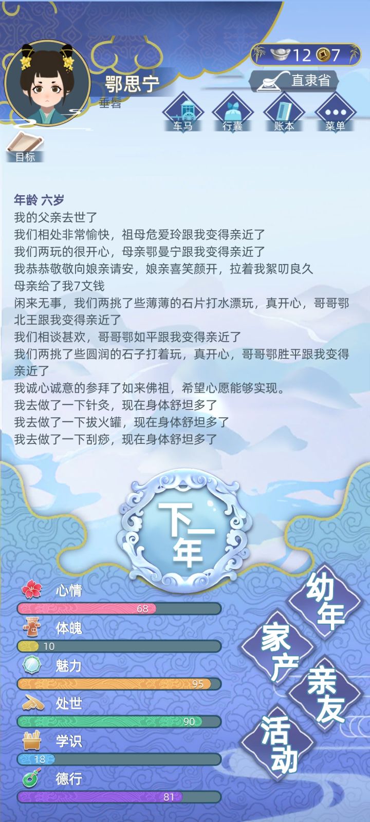 图1、图2是我第2代继承的角色,加上不动产,总资产已经积攒到接近2万两黄金了。然而我在57岁自杀投胎到最小年纪嫡女鄂思宁(第三代)身上后,竟然发现我原本应该带来的1578两黄金竟然消失了。而鄂思宁也从第三代人生变成了第一代(图5)。