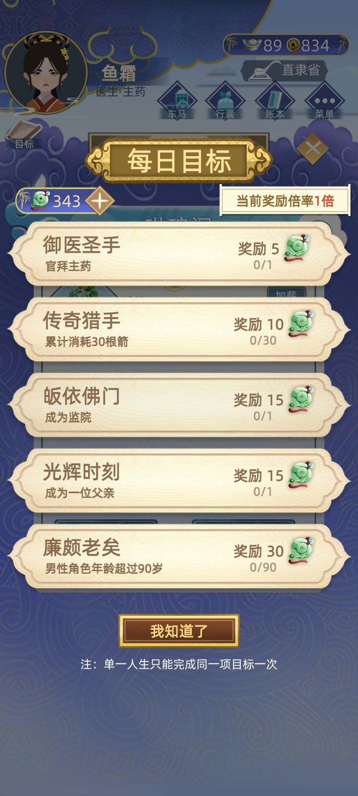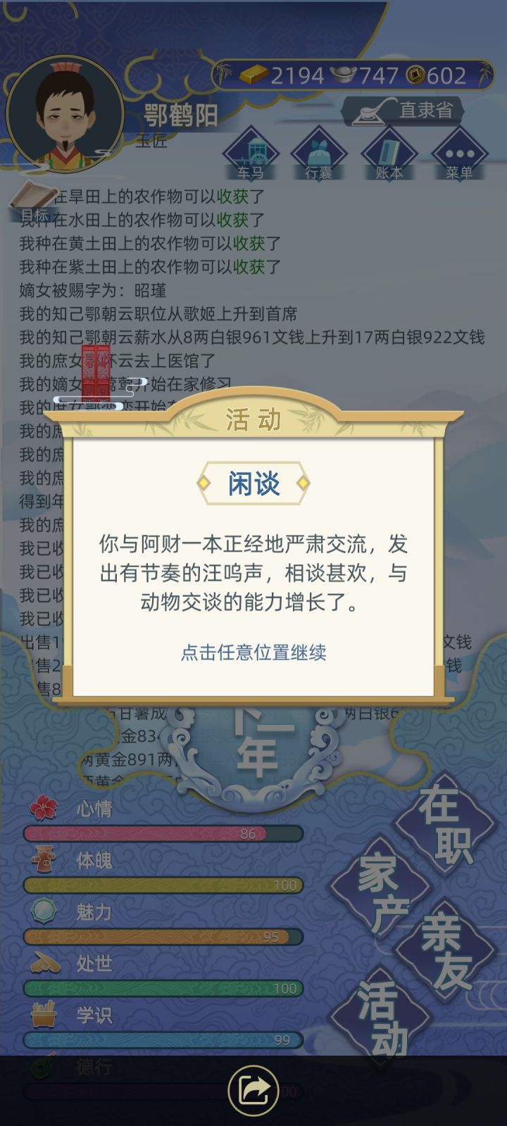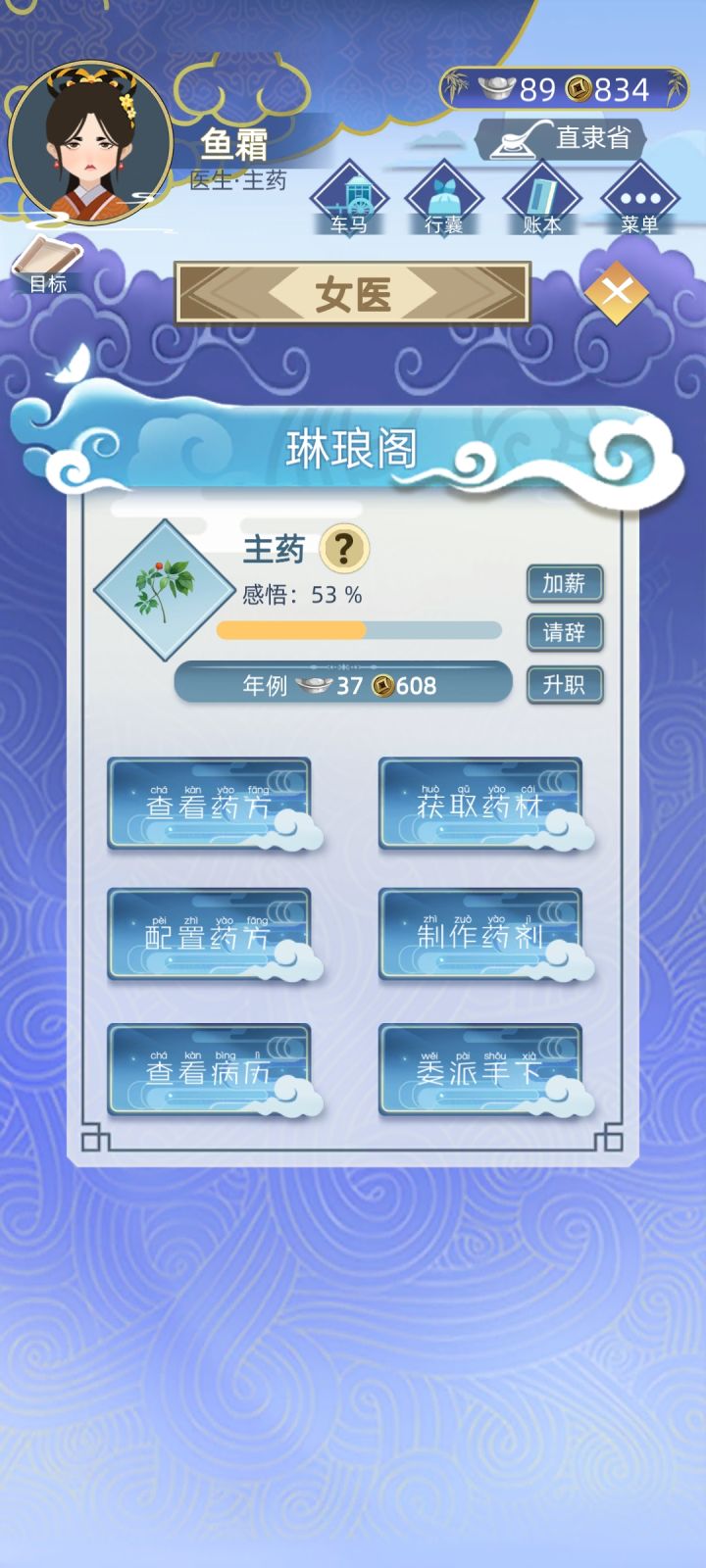 更新了的女医路线很有趣(我觉得抓药比较有趣~嘿嘿~),但是女医路线有个很明显的问题就是当官就职学习阶段不能离开直隶省,那就没办法结婚了呀,而且如果系统不主动跳出来长老给你选婚配就很容易孤独终老,无后而终…(我就是QAQ,三十五岁好不容易有一个说要娶我,后来第二年他就娶了别人…然后就没有培养好感情的了),而且如果本身不住直隶省就没法去会友,这个也很大限制了交友的记录只能靠随机事件… 还有就是我个人希