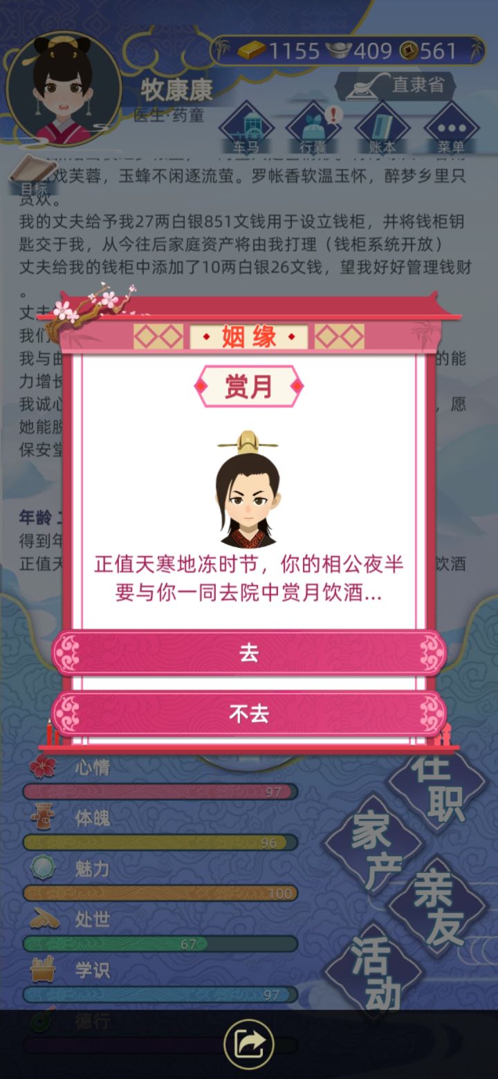 不知道是不是Bug,我原配早逝,再娶了和氏,约定2年后结婚,然后不知道是不是因为我给原配孩子定亲和看他们结婚,我就和和氏结不了了。我不能娶又不能退婚,我眼睁睁看着未婚妻头像的黑影变形,过去了九年,我实在等不了,纳妾生子,继承了。