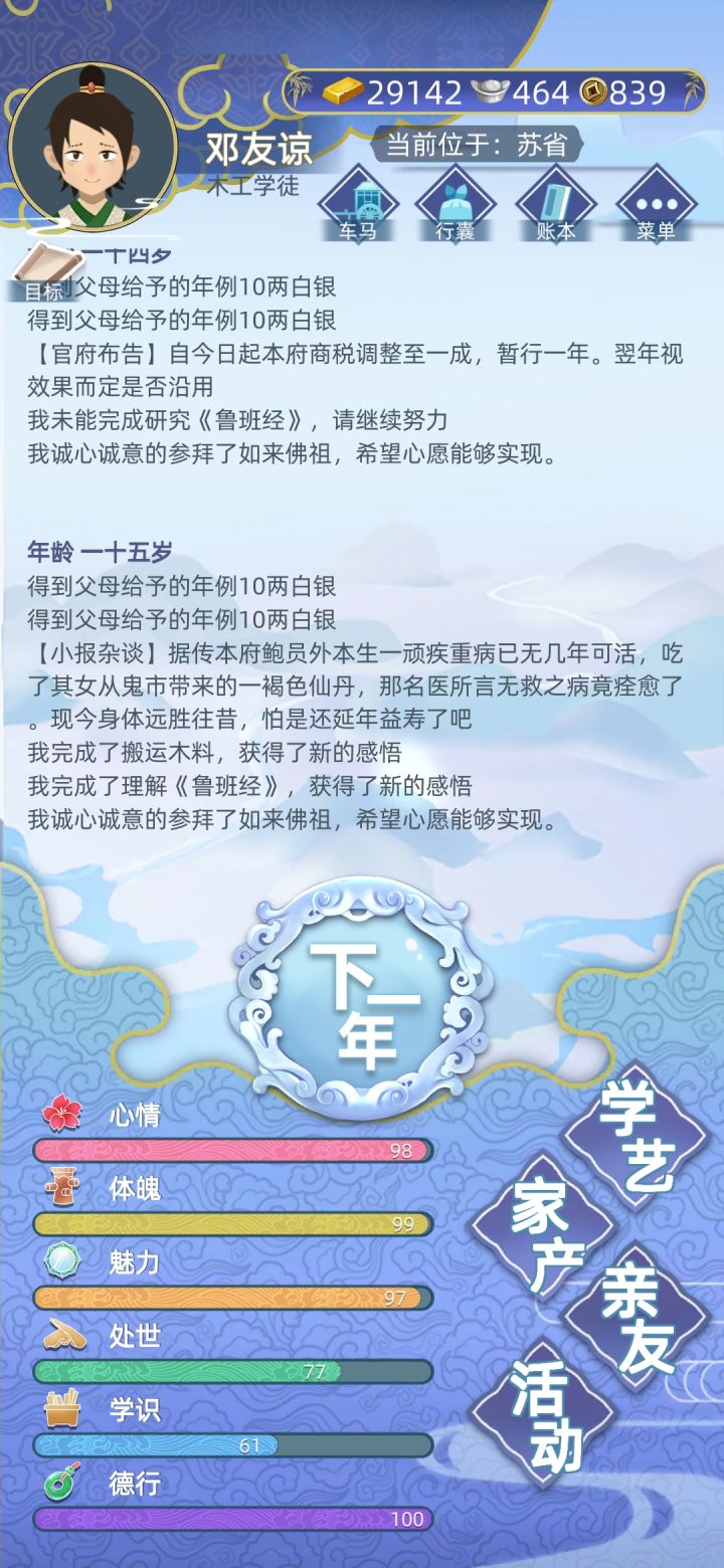 这种情况应该可以回乡的,希望能加入请假的选项,比如一年可以请假一次,一次可以去一个地方;还可以加一些出差/考察之类的事件。